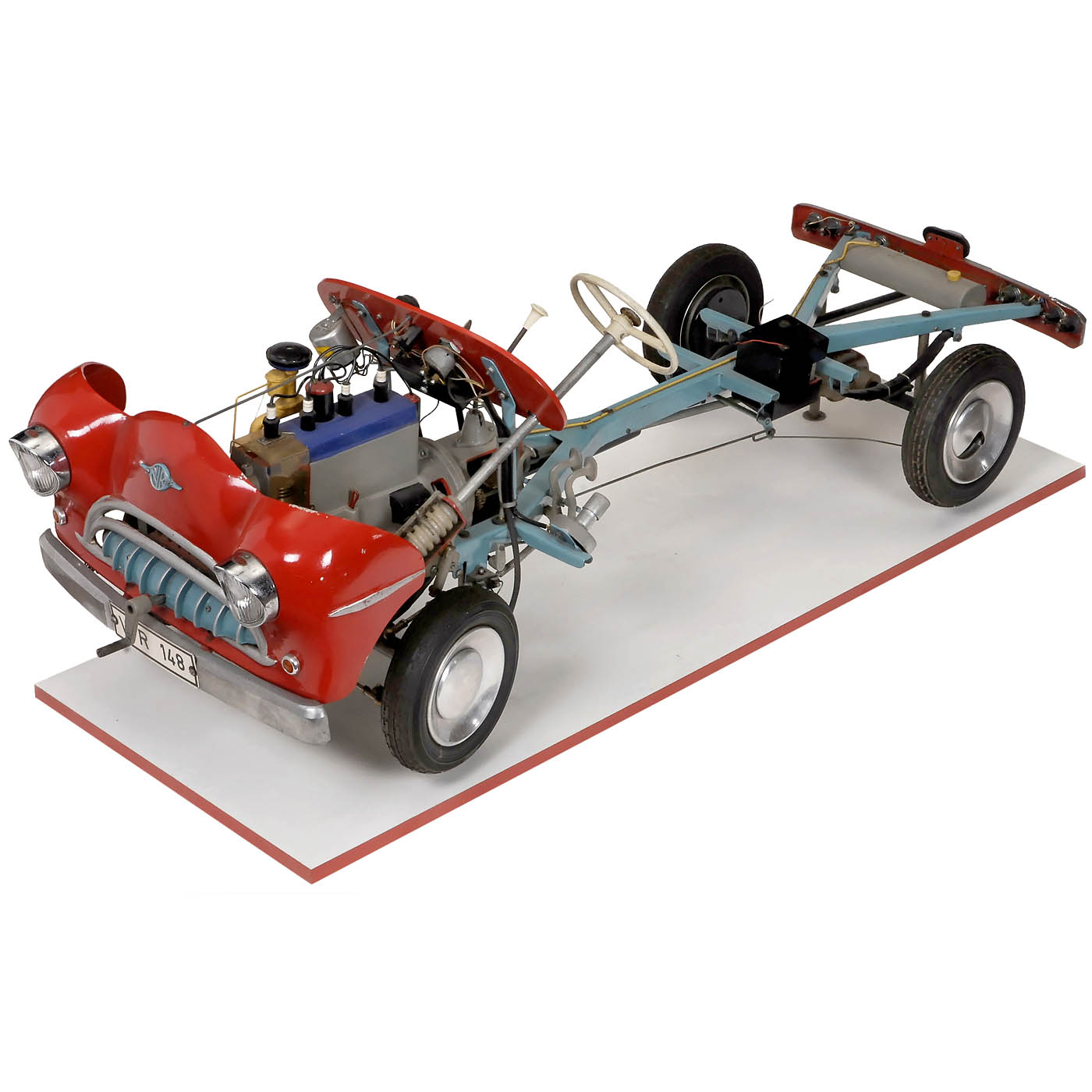 Manufactured by: "Verkehrs-Verlag Remagen". Measurements 51 x 19 2/3 x 15 2/3 in. Crank-driven demonstration model with working engine, lights, steering mechanism etc. - A fascinating exhibition piece and collector's item!