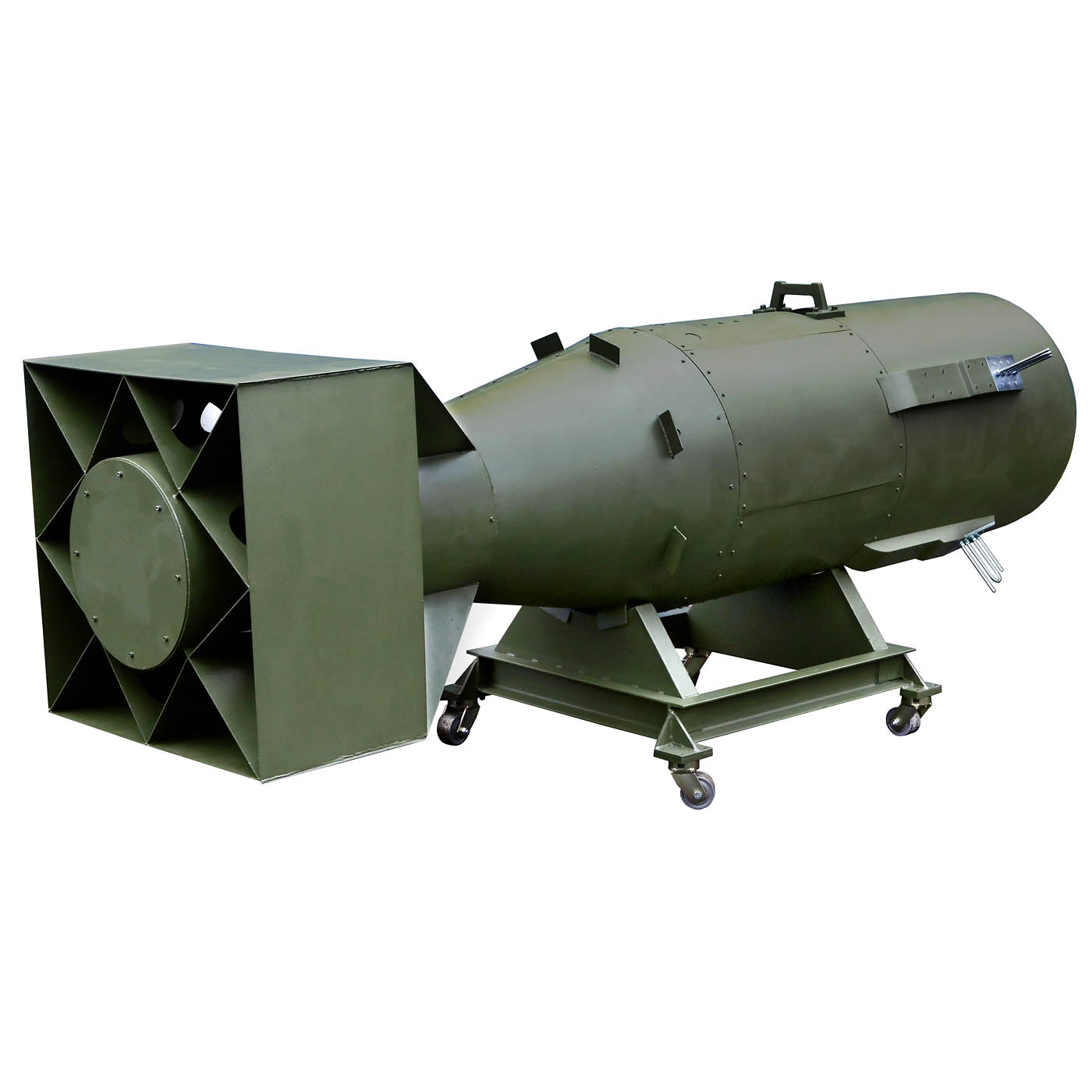 With original and replica U.S. Air Force parts, 300 x 100 x 120 cm, weight 310 kg, trolley 60 kg. So-called "pumpkin" bombs were deployed by the U.S. Air Force during the test and training phases of the 1945 atomic missions. Designed to be the same shape, size and weight as the atomic bombs, the "pumpkins" filled with cement and used in test flights with Silverplate B-29 aircraft at the Wendover Airfield in Utah. In addition to proving their aerodynamic qualities, the military also used the 'pumpkins' to test atomic bomb fuses via a small quantity of explosives which detonated at 1,800 feet. - References: http://worldwar2headquarters.com/ HTML/jons-ww2-blog/pumpkin-training-bombs.html