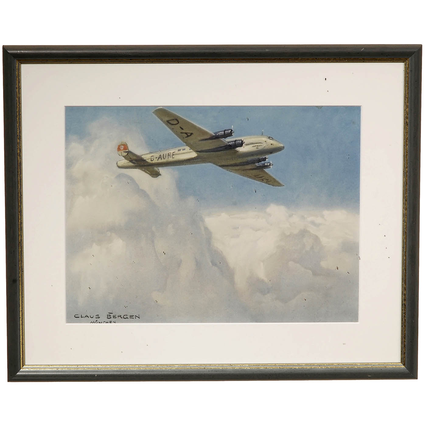 Watercolor painting on cardboard, Junkers Ju 90V3 of the Deutsche Lufthansa, mark D-AURE, in flight over the clouds, size of the picture 15 ¼ x 11 ¼ in., with passe-partout in frame, overall size 21 2/3 x 17 1/3 in., signed lower left.