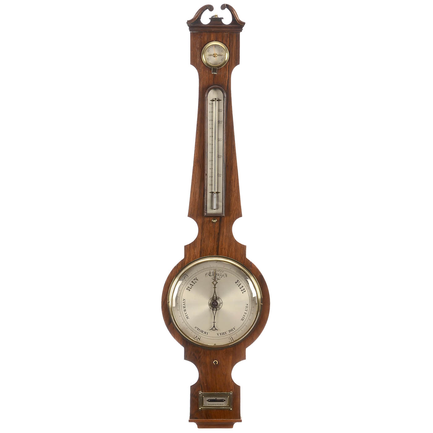 Silvered dials, with hygrometer, mercury thermometer and wheel barometer, 9-inch main dial, signed on the level "John Curotti, Warrented", overall height 39 in.