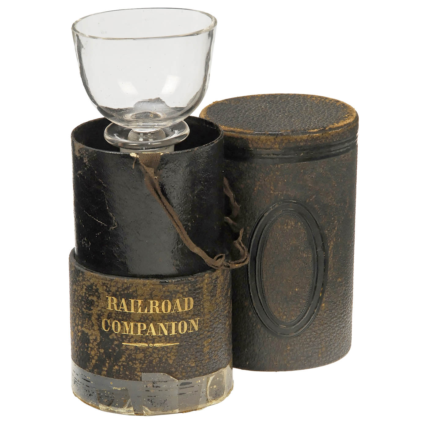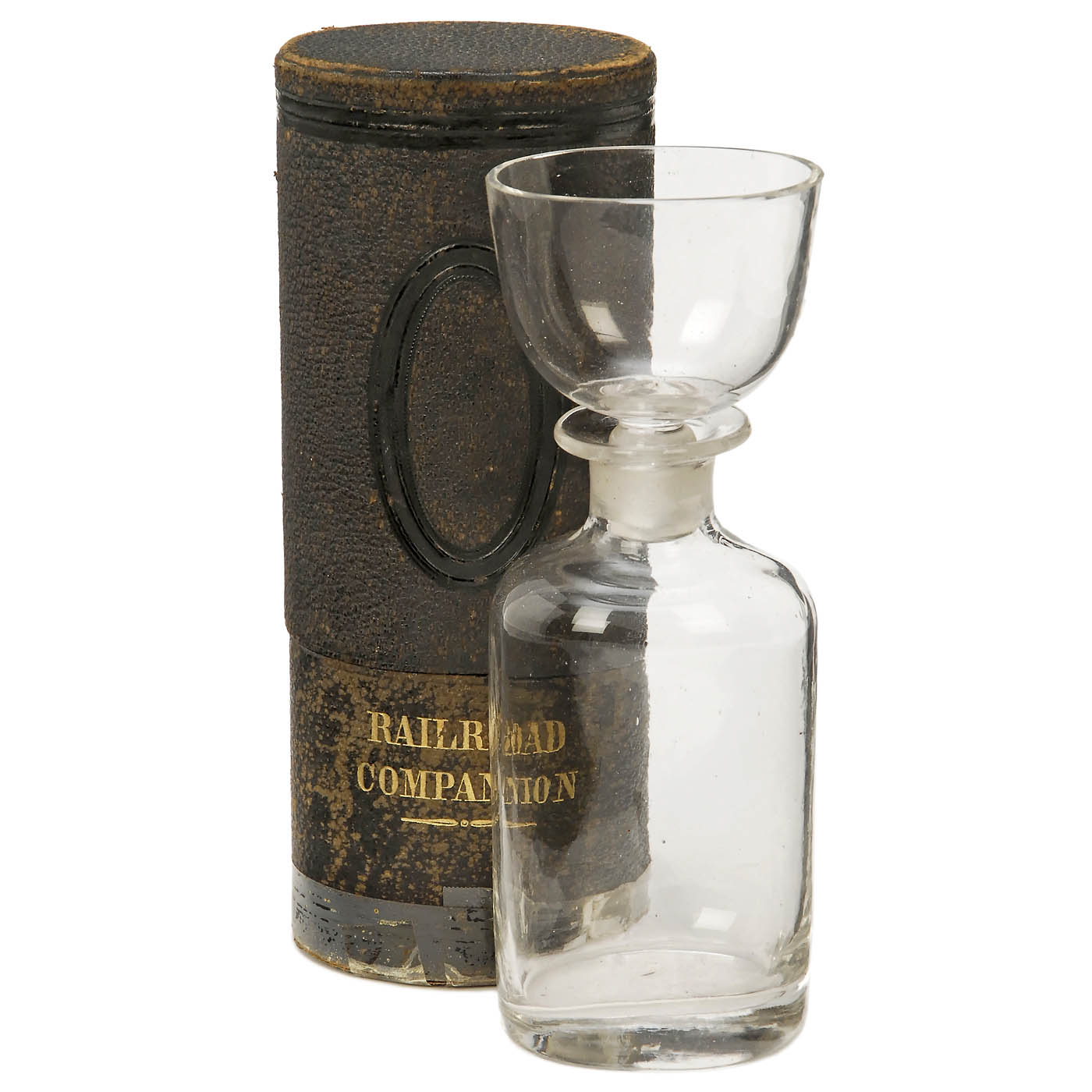 Handblown glass, ground stopper with drinking vessel, height 8 in., in matching leather-covered cardboard container, with embossed gilt lettering "Railroad Companion", base of container repaired. - A rare surviving 19th century travel companion.