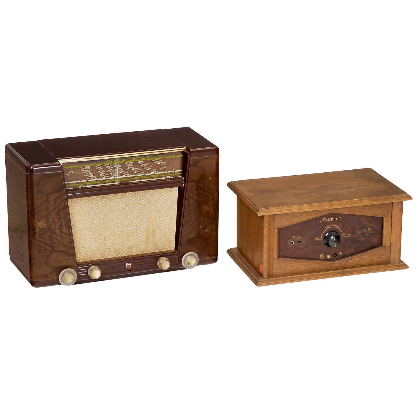 1) Radio Maxim, model E20, Switzerland, 2 tubes, 1924. - 2) Siemens 35W, Germany, 4 tubes, 1931. - 3) Pollux PO-WA, Koch & Sterzel, Dresden, 5 tubes, 1930. - 4) Philips BX400A, Netherlands, 5 tubes, 1950. - 5) Aetherkruiser AK 1481, Netherlands, no back panel, 4 tubes, 1948. - And: 6) Perfect, France, with Ferrix components, 2 tubes, c. 1928.