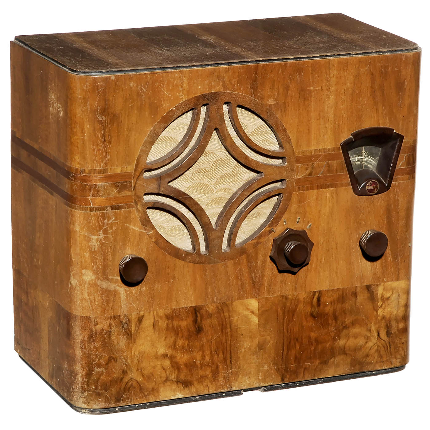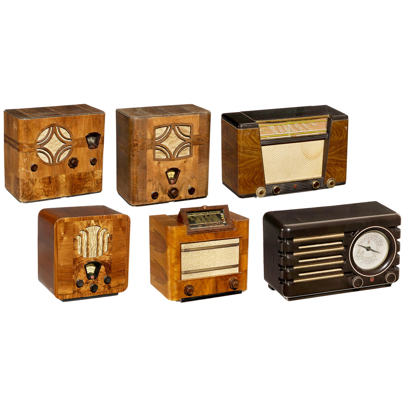 1) 736A, super-inductive, 6 tubes, wood case, 1934. - 2) 836A, super-inductance, 5 tubes, wood case, 1935. - 3) BX400A, Superhet, 5 tubes, bakelite case, 1950. - 4) 456A, Superhet, 5 tubes, wood case, 1936. - 5) BX378A, 6 tubes, bakelite case, 1947. - And: 6) 738B, Super-Inductance, 6 tubes, wood case, 1935. - All radios: mains-operated, integrated loudspeakers, complete with rear panels.