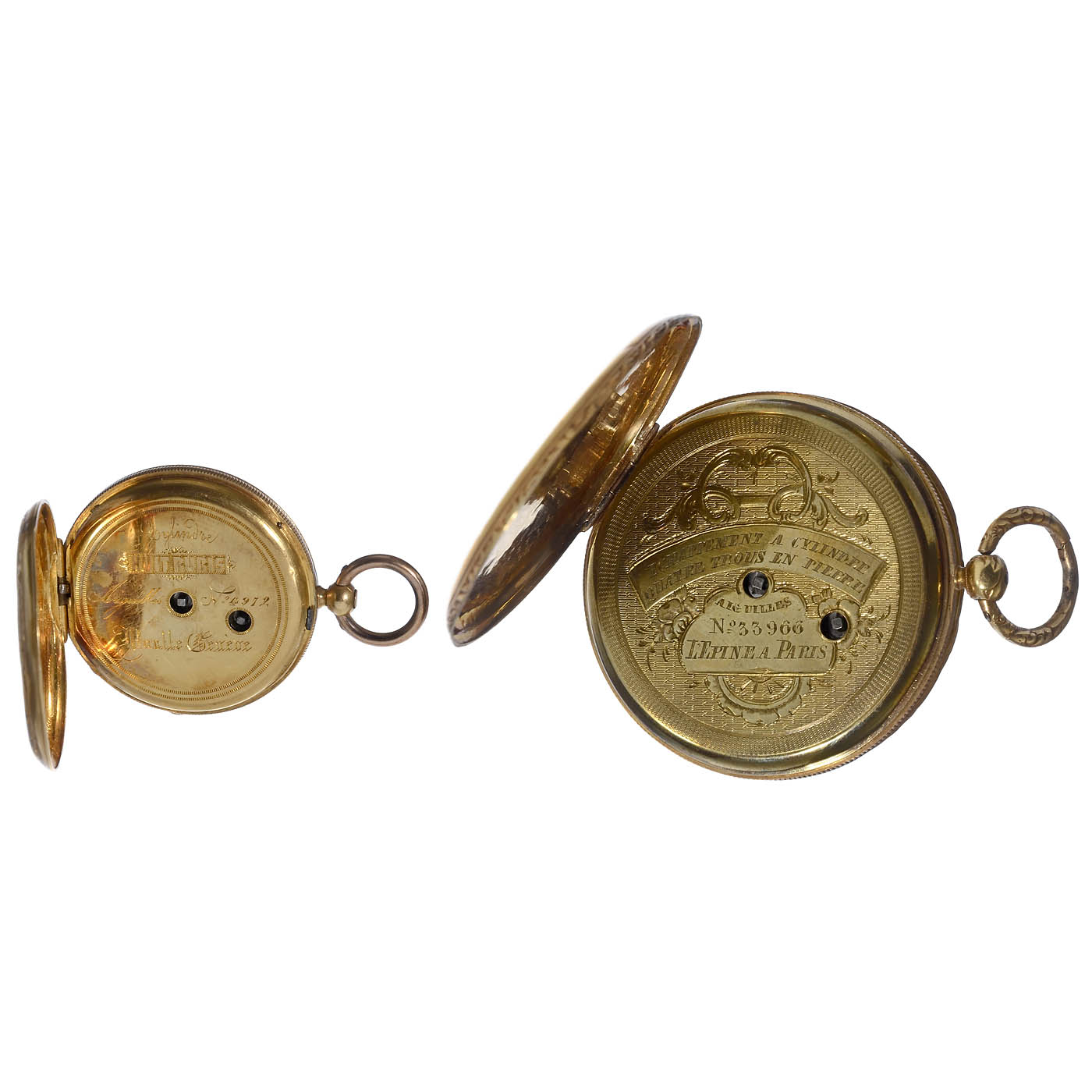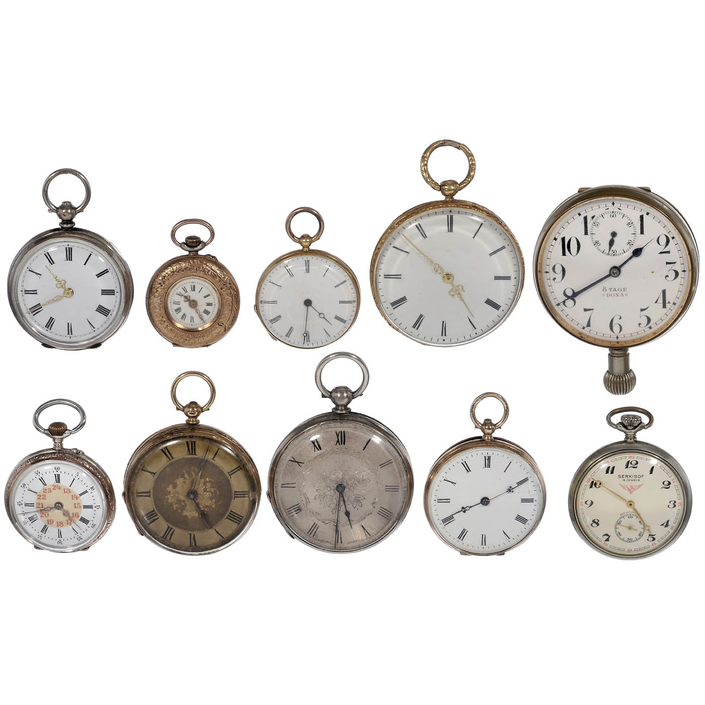1) Ladies' watch, Bautte Genève, no. 4972, key-wound, engine-turned gold case, enamel dial with hairline crack, Ø 1 in., with key, working, c. 1890. - 2) Hunter-cased gents' pocket watch, L'Epine à Paris, no. 33966, key-wound, engraved gold case, enamel dial, Ø 1 3/5 in., no key, working, c. 1840. - 3) Unmarked, France or Switzerland, no. 9551, engine-turned gold case, empty monogram cartouche, key-wound, brass dial with flower motif, Ø 1 2/5 in., no key, defective, c. 1880. - 4) Ladies' watch, unmarked, France or Switzerland, no. 86297, engine turned 16K gold case, key-wound, enamel dial with hairline crack, Ø 1 1/3 in., no key, working, c. 1890. - 5) Swiss ladies' watch, 800/1000 silver, capercaillie hallmark, no. 65083, enamel dial, key-wound, working, Ø 1 1/3 in., no key. - 6) Swiss ladies' watch, 800/1000 silver, half-moon, crown and capercaillie hallmark, no. 2854, enamel dial, crown-wound, working, Ø 1 1/5 in. - 7) Ladies' watch, probably gilded, no. 83001, crown-wound, defective, Ø 1 in. - 8) Russian railway watch "Serkisof", defective. - 9) "Doxa", Swiss 8-day travel clock, silvered case, enameled dial and subsidiary second dial, crown-wound, working, Ø 2 ½ in., c. 1925. - And: 10) Gents' watch, "Baume Genève", no. 49610, key-wound, defective, Ø 1 ½ in., c. 1890.