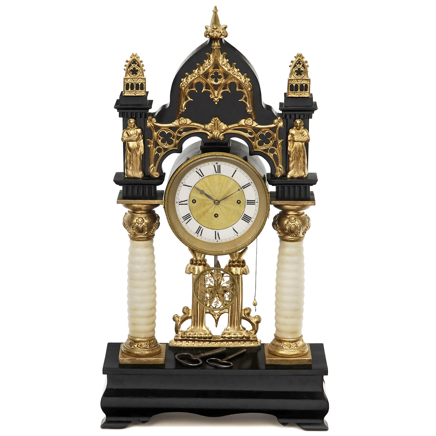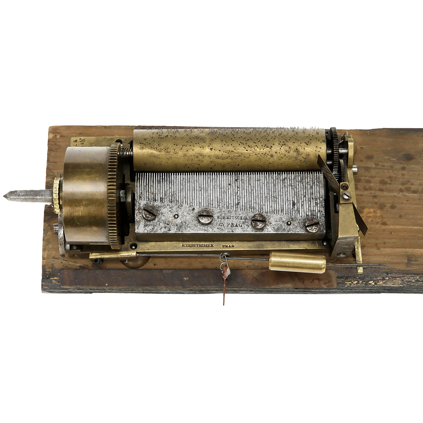 With 4 ¾-inch (12 cm) enameled Roman annular dial, three-train movement striking hours and quarters on two gongs, string-set repetition and activation for two-air cylinder movement stamped "Rzebitschek in Prag", No. 1897: 27789, with 82 teeth in comb (complete), bass teeth on the right, in architectural case with Neo-Gothic metal fretwork flanked by figures, ht. 26 in. (66 cm), case restored, a couple of dampers in need of adjustment, cylinder movement in otherwise good unrestored playing condition, clock movement running and striking but accuracy not guaranteed. With silk-suspension pendulum and two keys. - An attractive musical clock.