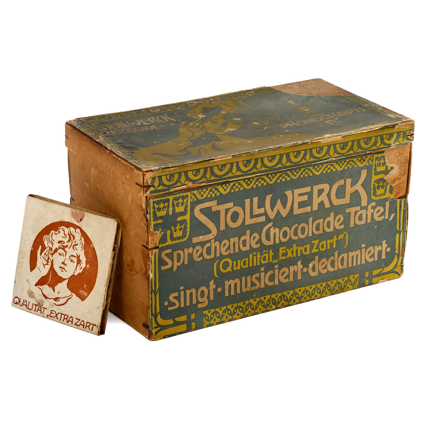 Model A, for Ø 3 1/6 in. chocolate discs, turntable doubles as disc-storage compartment for 6 discs, original red lithographed finish with gilt highlights, in good condition, hand-driven. Very rare red version! With original (model B) box and 1 chocolate disc
