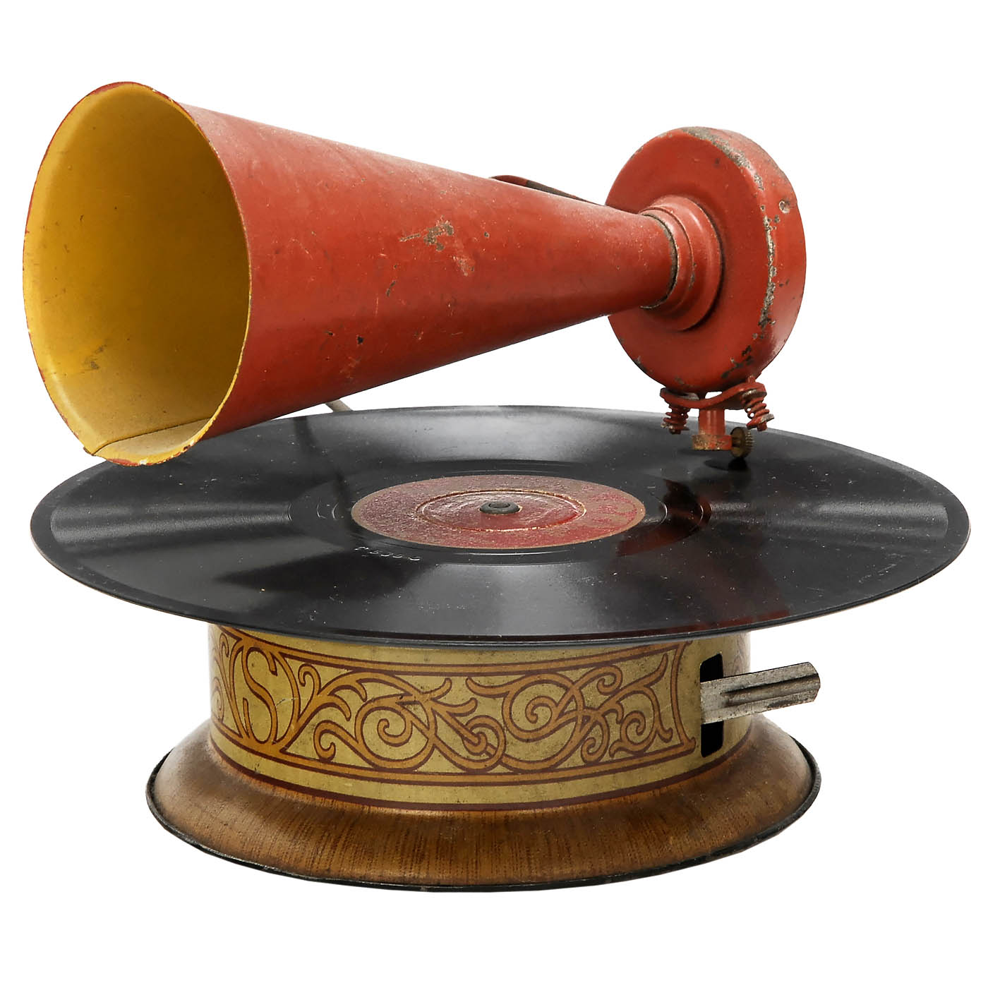 Germany. Lithographed tin, spring-driven, working. A very small and rare gramophone. With integral key.