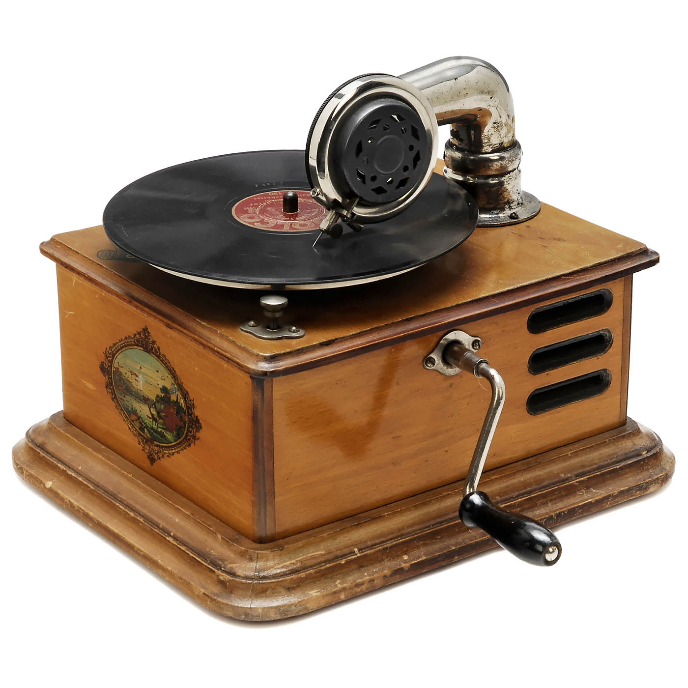 Spring motor, for discs of up to 6 in. diameter, wood case with decals, working.