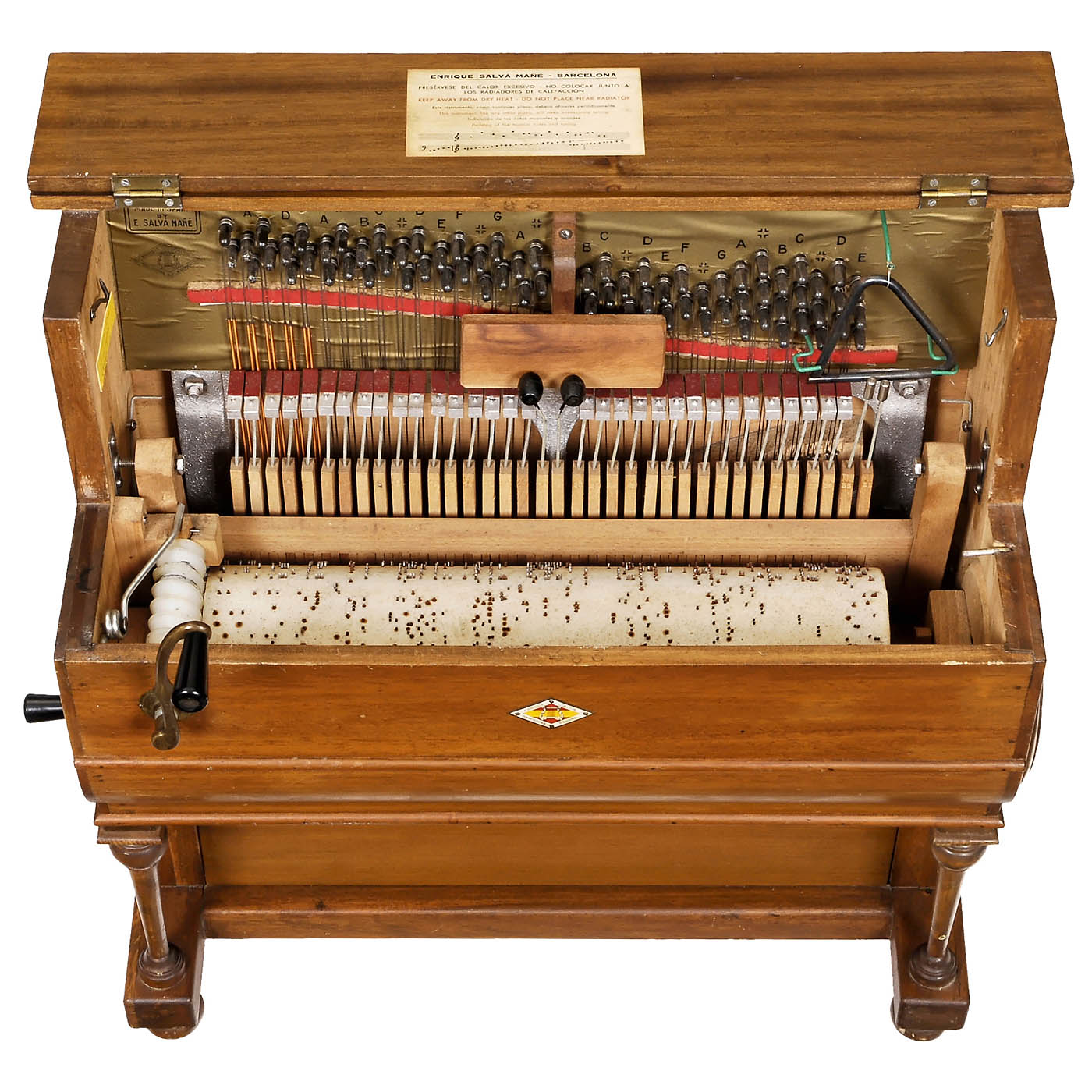 Barcelona, Spain. 36 keys: 32 for the piano, 2 for the wood block and 2 for the triangle, 6-air pinned wood cylinder, hand-cranked, tune indicator, polished walnut case, 22 ½ x 11 x 24 ½ in., good working condition, needs tuning, with tuning lever and second barrel in wood case.