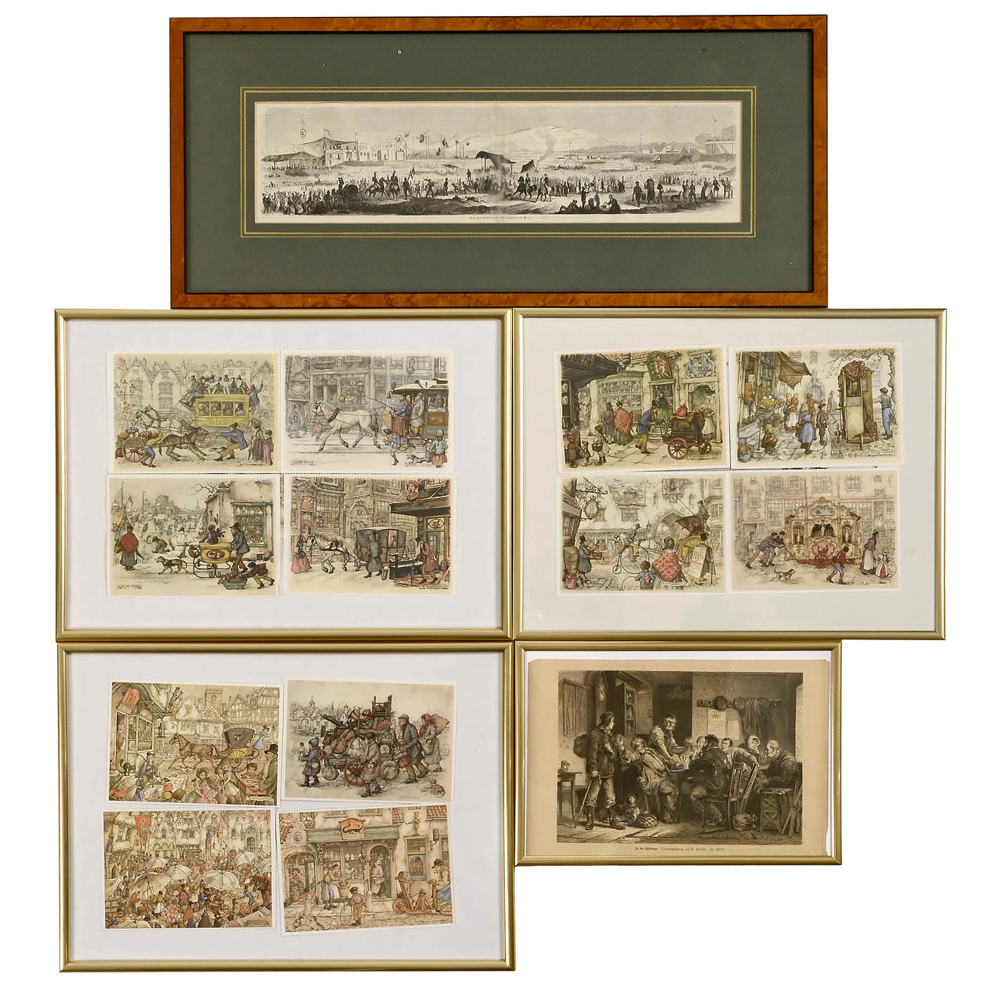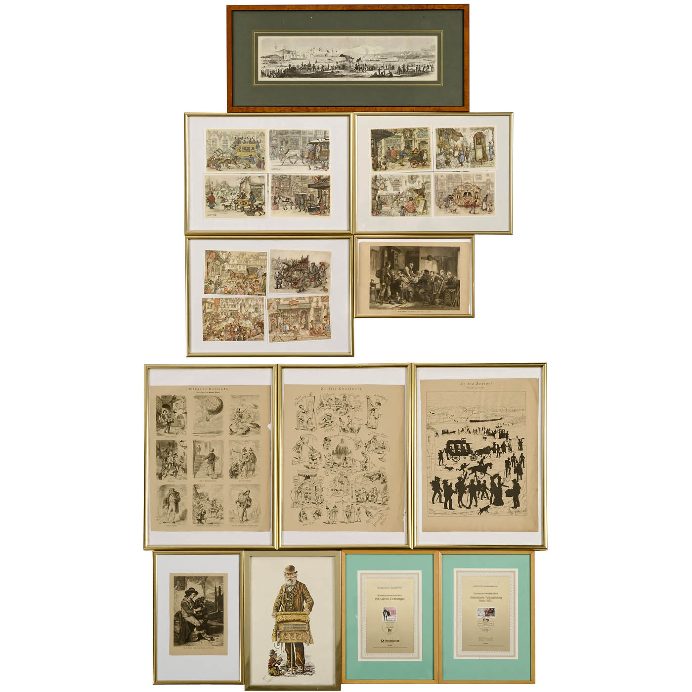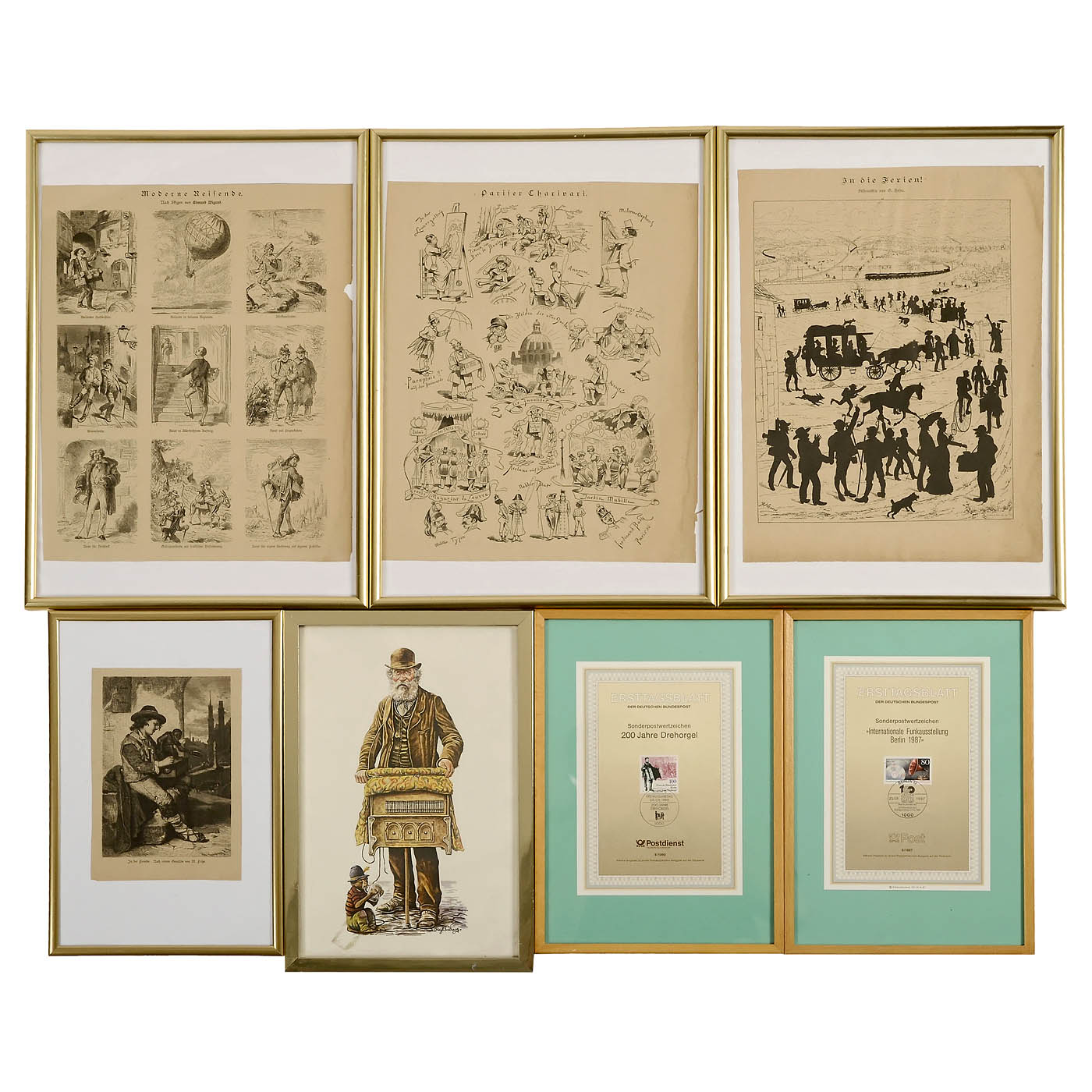 Historical motifs: organ grinders, fairground organs, fairgrounds, passengers, cityscapes and others. Size up to 17 x 12 and 25 x 11 in. - In addition: 2 framed first day cards: "100 years records" and "200 years barrel organ".