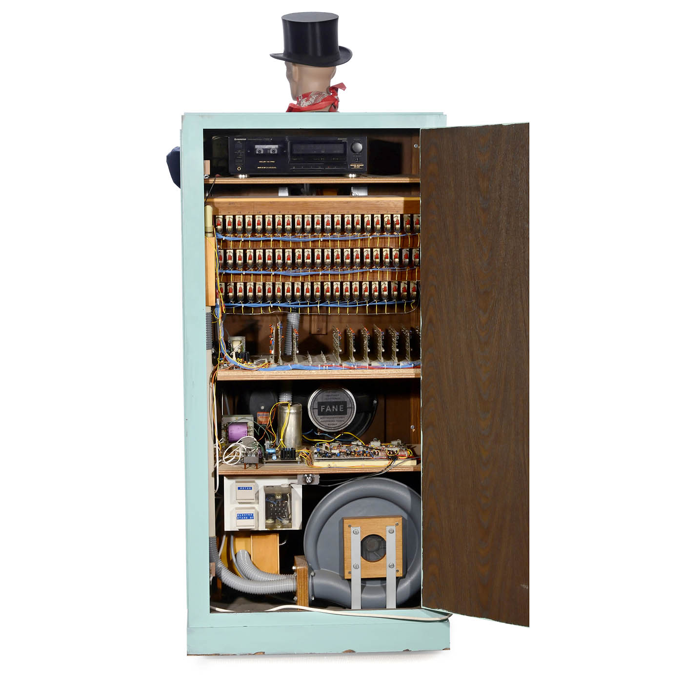 Anvers, Belgium. Life-sized automaton figure with Crucianelli accordion, wood case with blower and electronic MIDI control, cassette data storage (including 2 cassettes), overall height 82 in., 230 V, excellent playing condition.