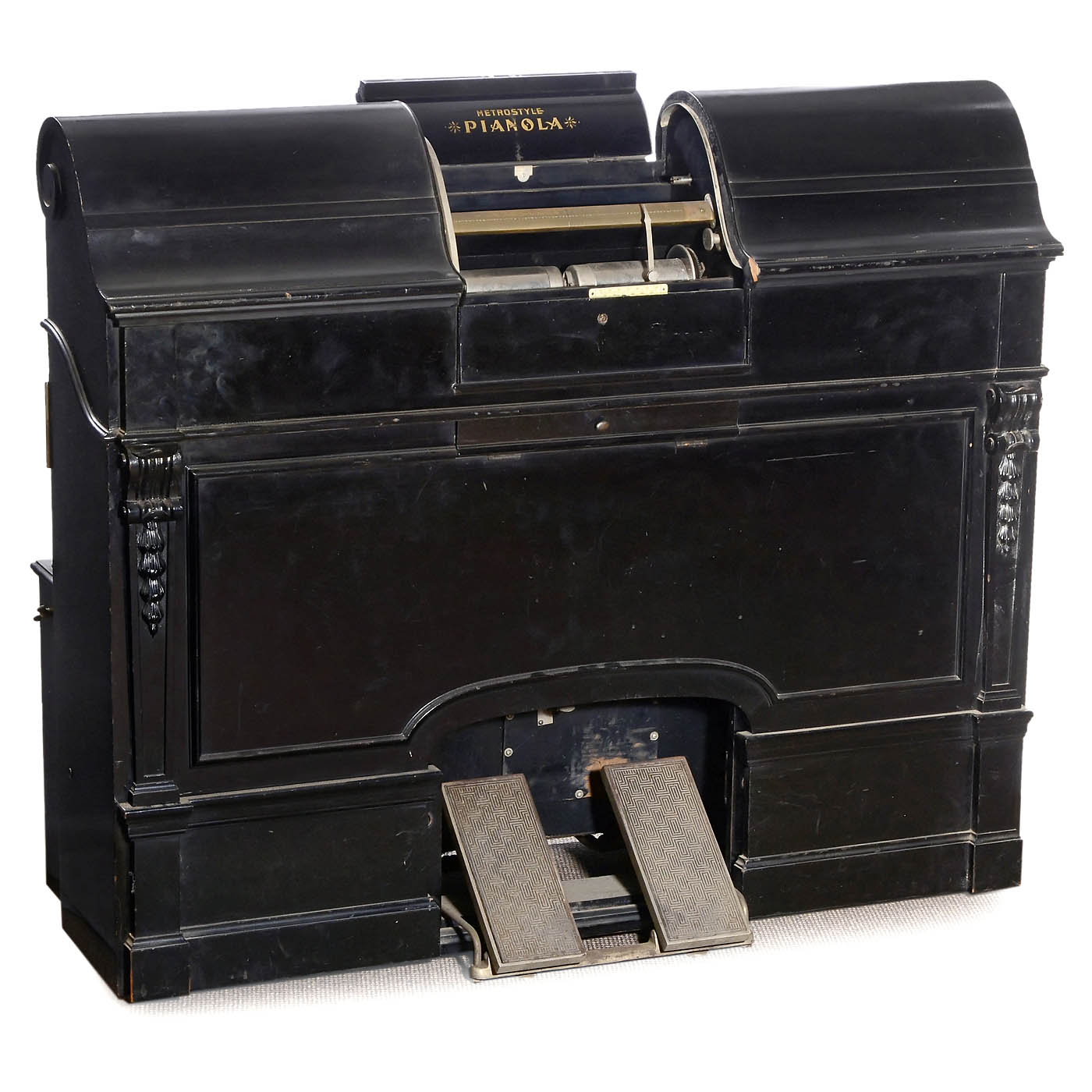 Aeolian Company, New York. Pedal-operated, black-lacquered wood case with 2 carved columns, good condition, appears to be working.