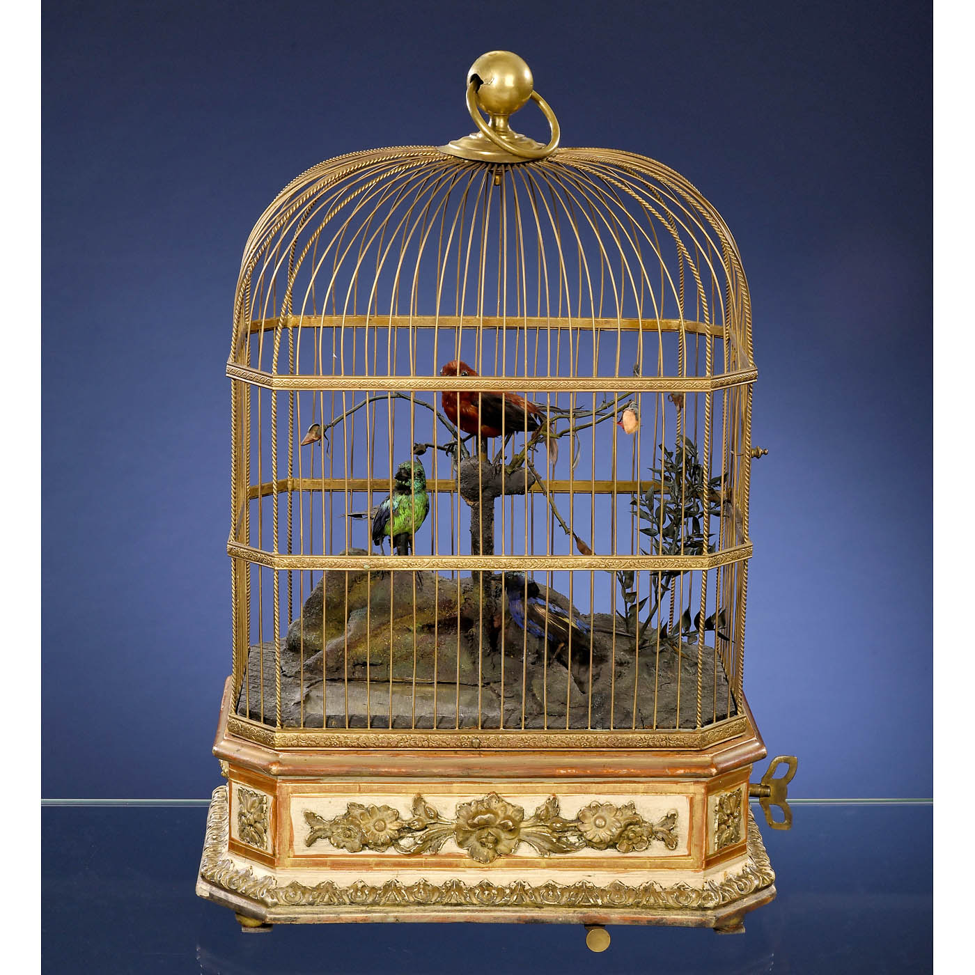 3 birds with original red, green and blue plumage, articulated heads, beaks and tails, in papier-mâché landscape with foliage and reflecting pool, under domed brass cage with suspension loop, on giltwood and gesso base with original finish, canted corners, floral relief and acanthus leaf moldings, the going-barrel movement with bellows, whistle and timed stop-start lever causing each of the birds to sing in turn, ht. 22 ½ x wd. 15 in. (56,5 x 38 cm), mechanism not opened for inspection. - An impressive piece, in excellent working and singing condition!