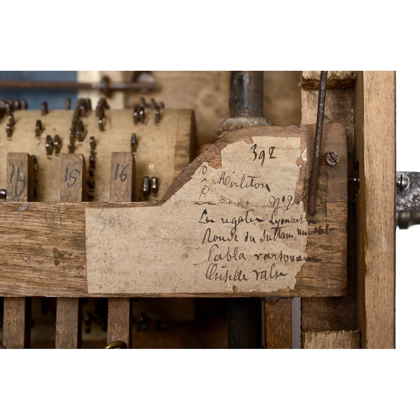 No. 392 on barrel and case, with six-air barrel operating five cams that cause the monkey musician to move his head, blink and chatter while playing the cello with two movements of the right arm, in pink satin tailcoat and cream silk waistcoat with metal-thread edging, a tricorn hat, music stand and instrument case at his feet, on mahogany-veneered base, height 21 ½ in. (54 cm), barrel 10 ½ in. (27 cm), eye movement not active, otherwise in good working and playing condition. With manuscript tune-sheet and crank. An attractive example of this popular piece.