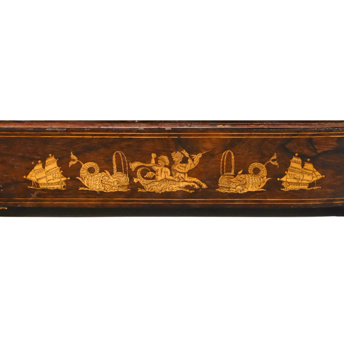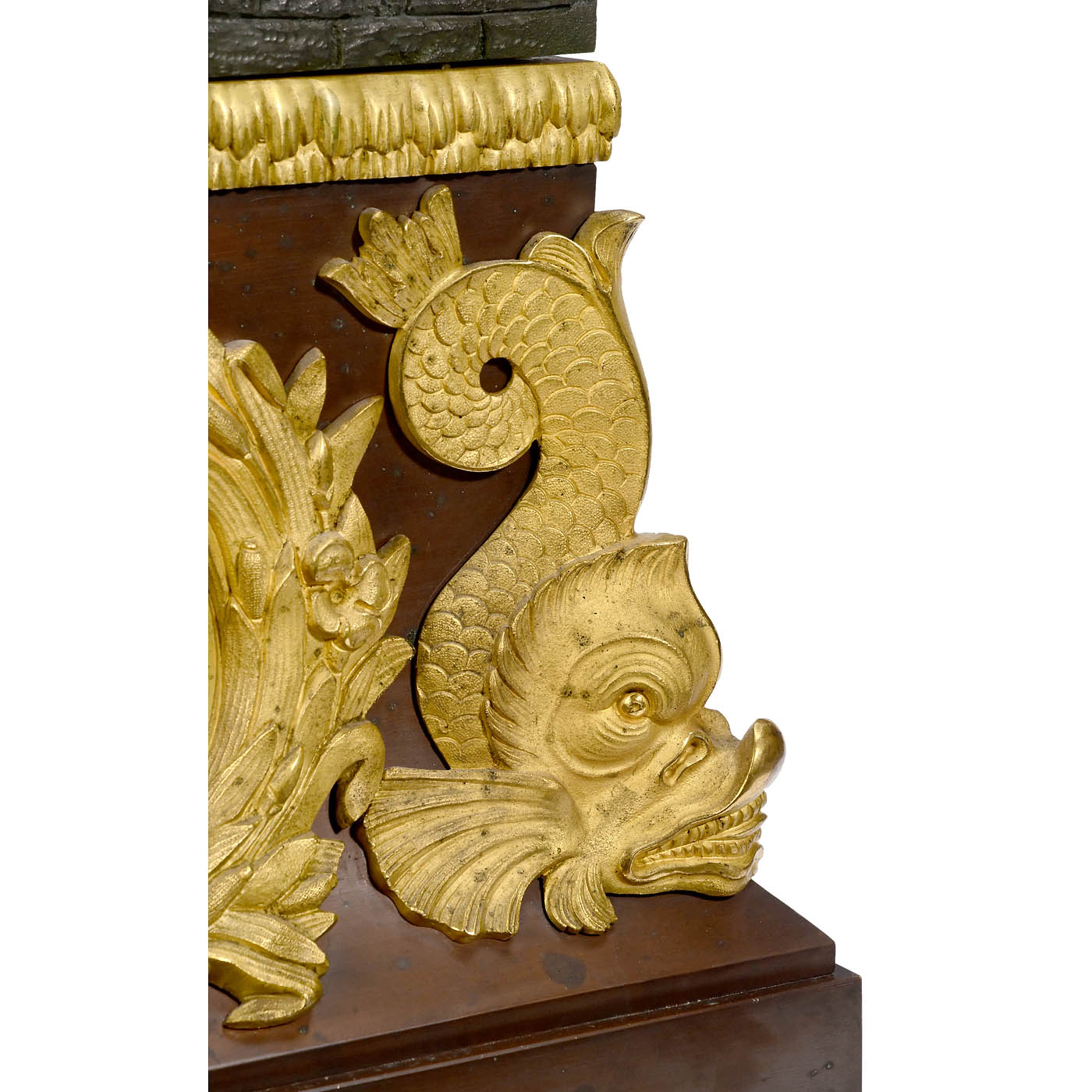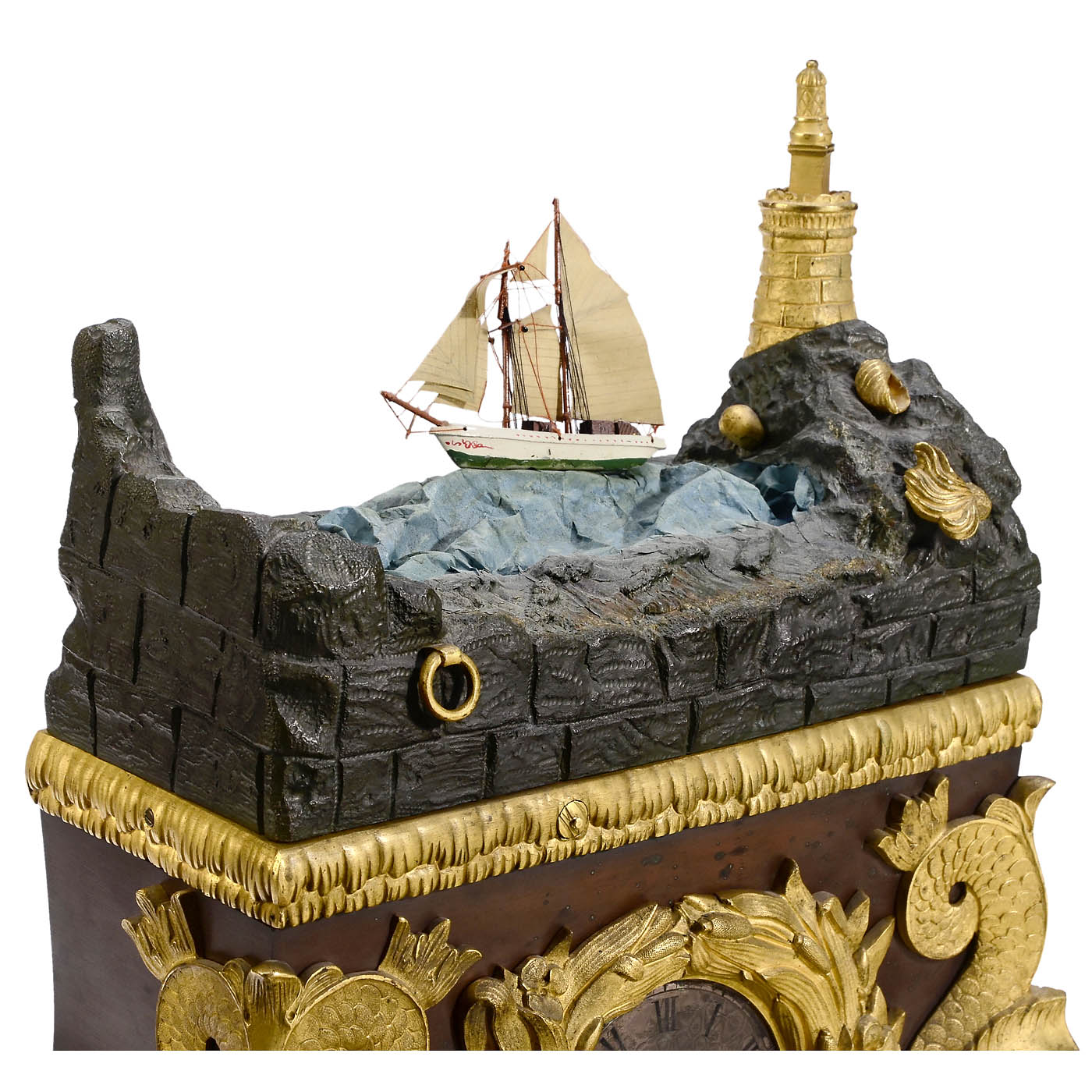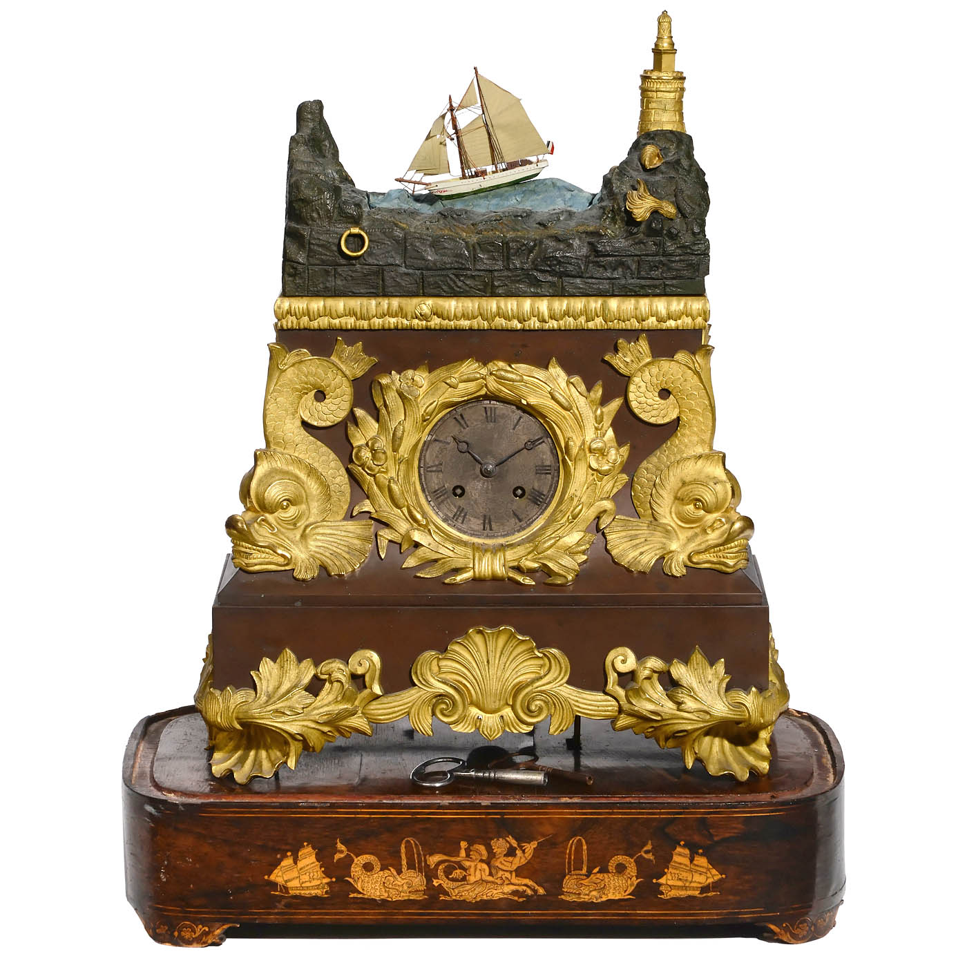 France, with 3¼-inch (8,3 cm) engine-turned Roman dial, two-train movement No. "61 PD 2217", striking hours and quarters on bell, upper section with cold-painted automaton harbor scene of a sailing vessel tossed upon tissue-paper waves, going-barrel movement stamped "J.C. Cailly", "Eude" and "Breveté", pencil inscription "Alexandre 276", winding key concealed by a metal plug, the flared copper central section with ormolu mounts of shells and rushes, a pair of twin-tailed sea serpents coiled at the corners, on veneered base with boxwood inlay depicting mythical figures, sea serpents and ships, ht. 22 in. at tallest point x wd. 18 in. (56 x 45,5 cm), automaton in good working condition, clock movement untested, start/stop connection replaced. With two keys. - Horologists Pierre-Joseph Eude of Offranville and Jacques Cailly of St. Nicolas d'Alièremont appear in the "Bulletin des lois de la République Française 1837" for their Brevet of 27 May 1835 - a mechanism that simulated the action of a small boat upon the ocean, for use on clocks and other ornamental objects. The counterweighted mechanism creates a realistic rolling movement of the waves. - A rare and impressive piece.