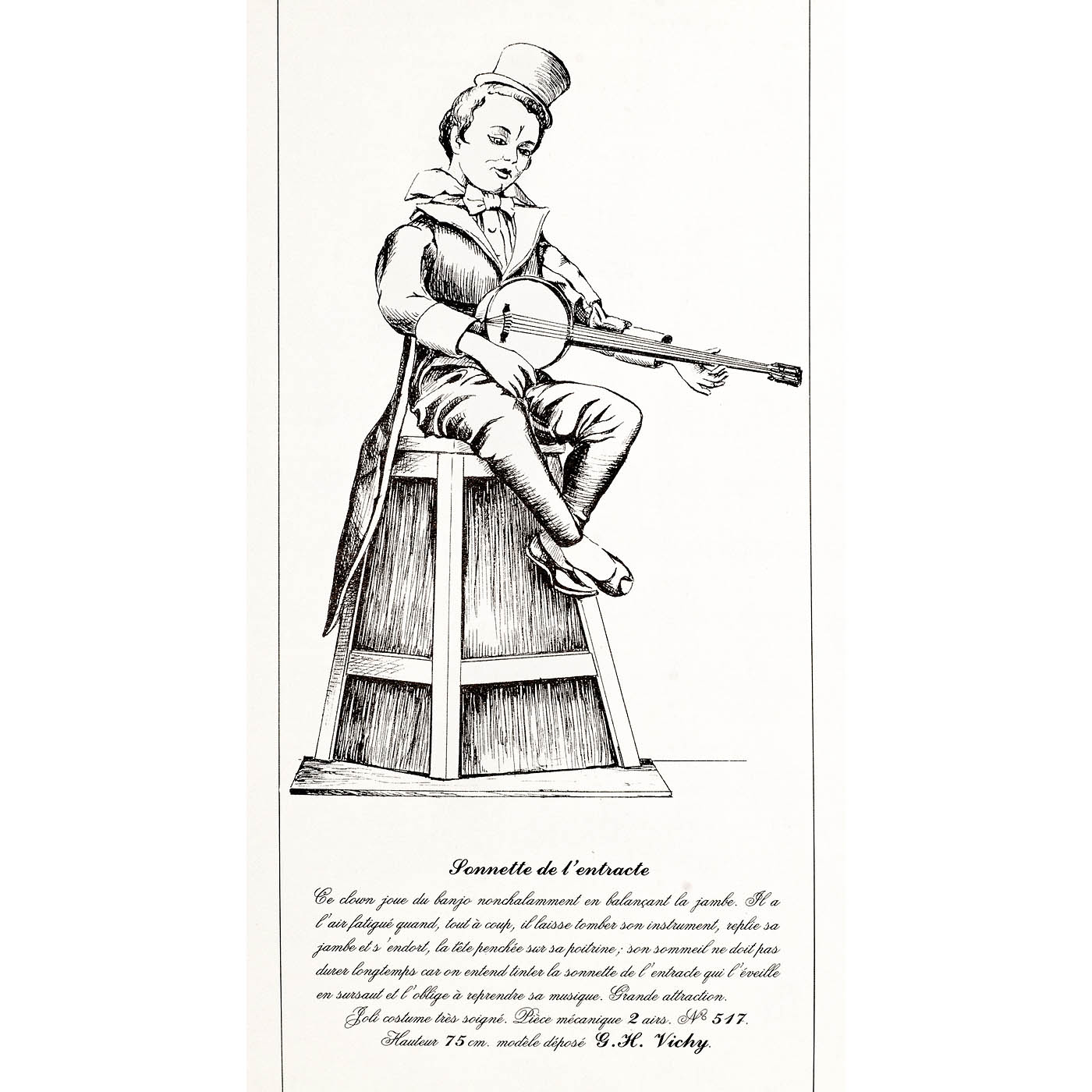 With plaster-composition head, blue-tipped nose, a telegraph motif decorating his forehead, red mohair wig, brown glass eyes, articulated eyelids and lower lip, seated on trapezoidal stool containing going-barrel motor with seven cams and intermittent two-air cylinder movement, dressed in checked silk trousers and striped silk tailcoat with raised velvet pattern, ht. 29 in. (74 cm), With size 13 steel key and acorn-form stop/start. - The clown sleeps whenever he gets the chance. The intermission bell interrupts his slumbers, not once but three times. On the first two occasions, he wakes briefly, opens his eyes and then returns to sleep. The third ring reminds him of his audience and finally obliges him to start playing. He lifts his head, raises the banjo as strums as the music begins. He looks around and nods while swinging his right leg and moving his lower lip as though singing until he becomes tired again. He blinks heavily, his arm falls inert, his head drops and the music stops. - Literature: Christian Bailly, "Automata, the Golden Age", p. 262. - Listed in the Vichy catalog as a "modèle deposé" (a patented model), "Sonnette de l'Entracte" was created during the period of artistic cooperation between Gustave Vichy and his son Henry. It is a complex piece with a long sequence of actions, one of several prestigious automata described in Chapter VI of Léo Claretie's history of the toy industry, "Les Jouets, Histoire - Fabrication", published around 1893. - We know of only four other examples of this automaton: one formerly in the York Museum of Automata; Lot 329 at Sotheby's New Bond St., 15 September 1993; Lot 518 at Auction Team Breker, 5 November 2016; one in a private collection. This example has been sympathetically restored. Restoration included the paint surface, reconstruction of the stool in period wood and costuming to the original pattern in antique fabric. - Good working and playing condition.