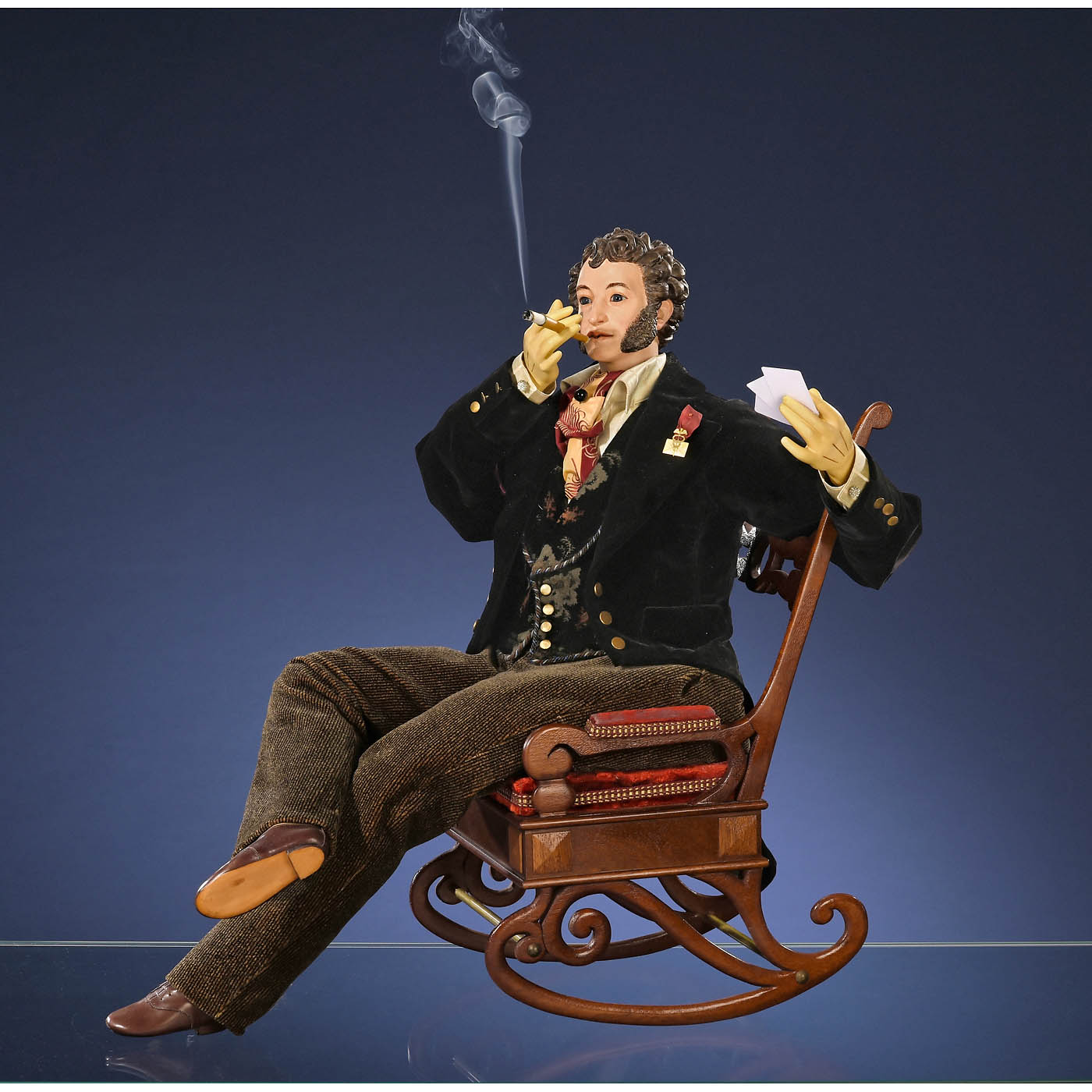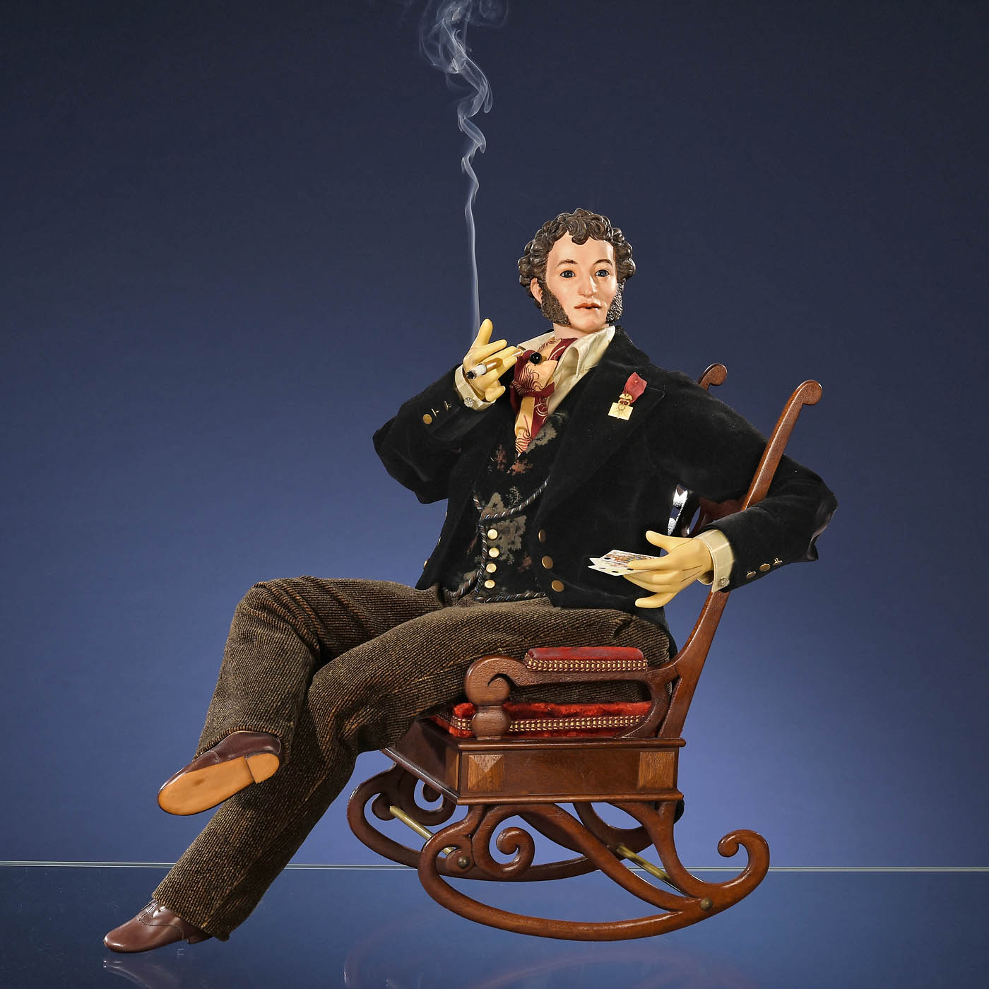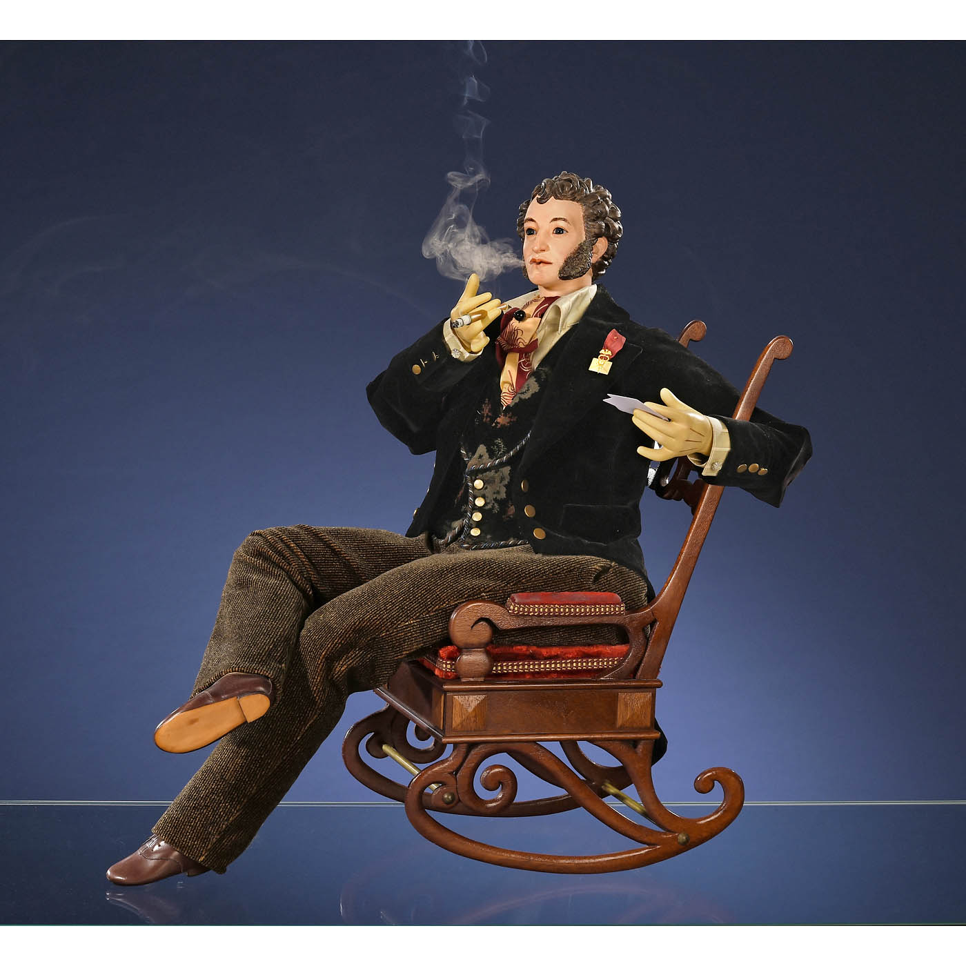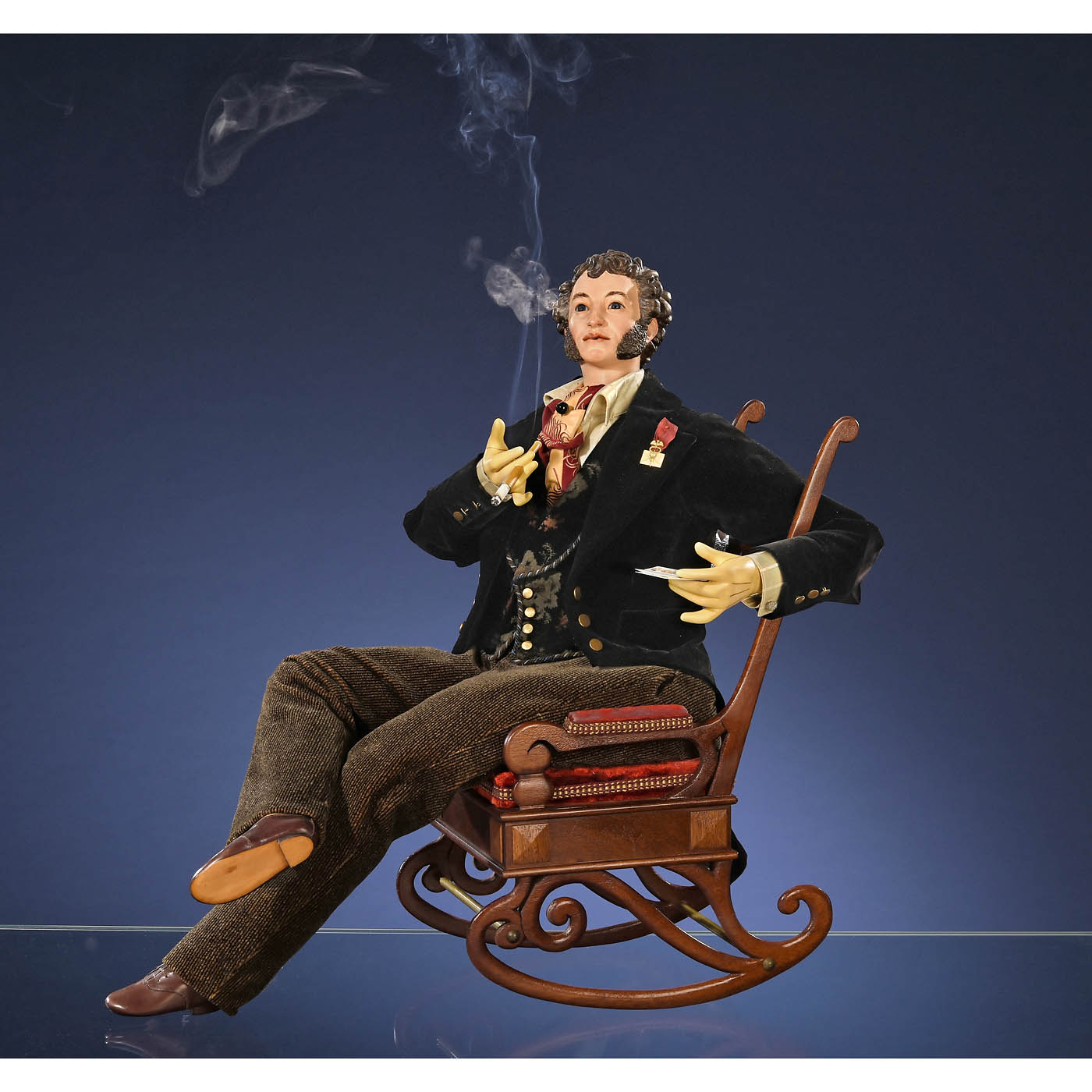 Inspired by an automaton by Gustave Vichy, with plaster-composition head depicting a young man with classical profile, sculpted hair and pensive gaze, gloved hands elegantly posed with cigarette-holder and playing cards, articulated head, arms and left knee, the torso containing crank-wind going-barrel movement that drives cams, two-air cylinder movement and bellows, in black velvet smoking jacket, figured waistcoat, open-collared silk shirt, pinstriped trousers and leather shoes, height 23 ½ in. (60 cm), with crank key and brass stop/start, excellent working condition. - Bailly portrays the 19th century Romantic playwright, poet and novelist reclining in a rocking chair during a game of cards. Pushkin rocks gently back and forth, raises the cards with an expansive flourish, lifts the cigarette-holder in his right, turns his head and leans back to exhale. - This pastime recalls the writer's early life and his passion for drinking and gambling. In his hand he holds three playing cards (the three, seven and queen of spades) for the fateful game of Faro in Pushkin's 1834 supernatural short story, "The Queen of Spades". - The sensitive modeling of the figure's facial features was based closely upon contemporary portraits while his relaxed pose, by chance or by design, is reminiscent of Valentin Serov's 1899 sketch "Alexander Pushkin on a Park Bench" in the State Museum of Alexander Pushkin, St. Petersburg. - A remarkable contemporary automaton.