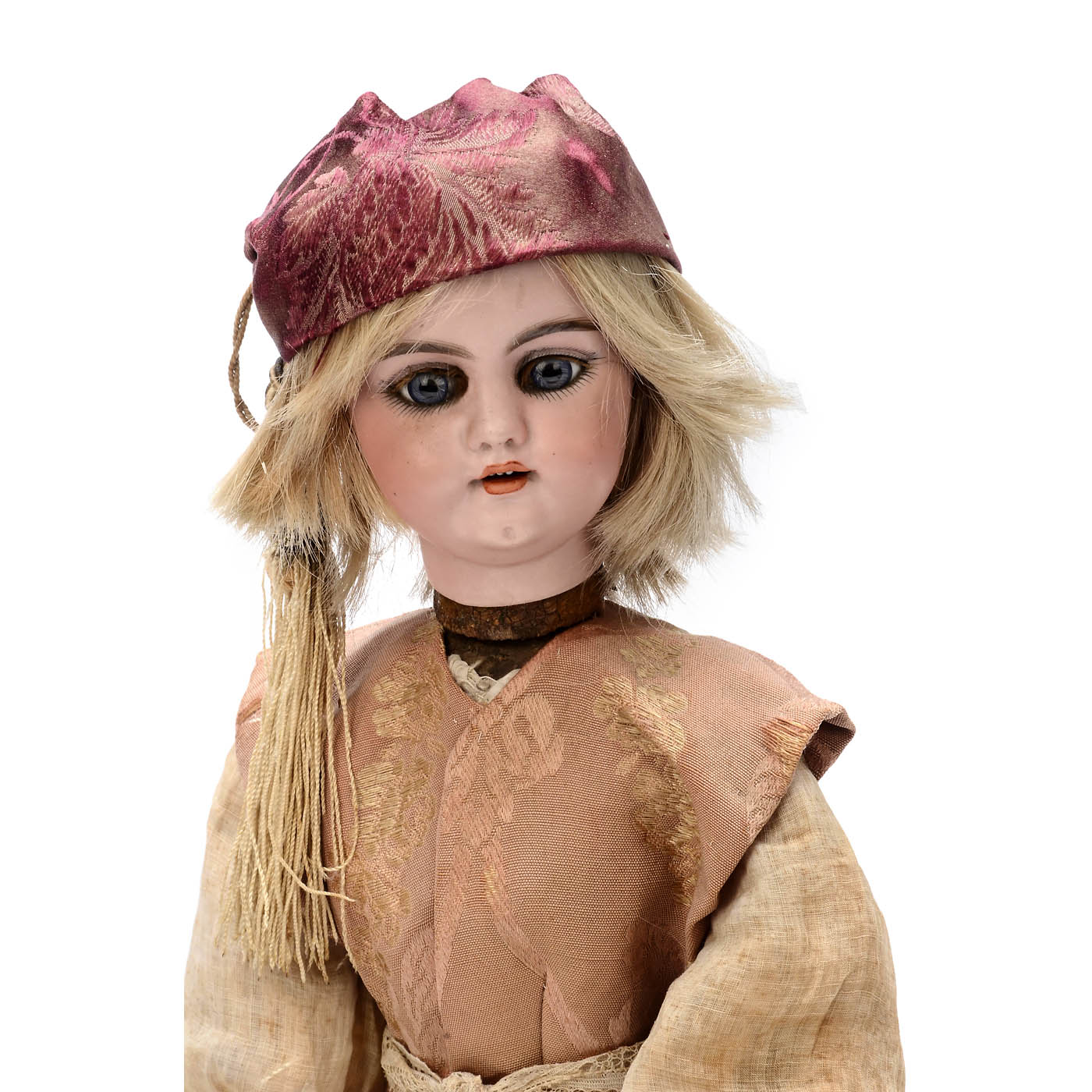 With Simon & Halbig bisque head incised "1300-6 DEP S & H". Open mouth, fixed blue glass eyes, later wig and clothing, on velvet-covered base containing three-cam going-barrel movement activating head, right arm and jumping action for a dancing dog (dog is missing), ht. 19 ½ in. (49 cm), hairline crack from corner of left eye to neck socket, right arm chipped, unrestored working condition, without musical movement or key. - Literature: Christian Bailly, "Automata, the Golden Age", p. 308 for R&D catalog illustration.