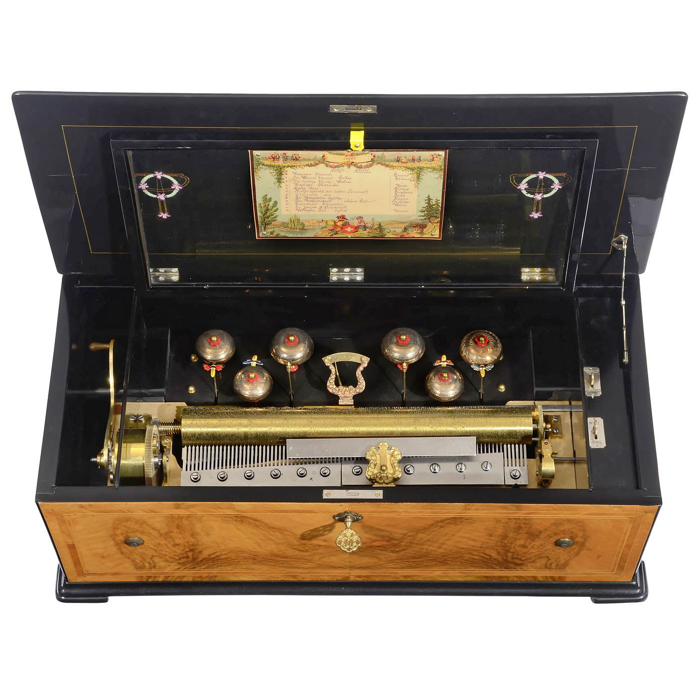 Probably Karrer. No. 16667, playing twelve dance and operatic airs accompanied by six optional engine-turned bells with insect and finial strikers, with 82 teeth in the two music combs and six teeth in the percussion comb (all three complete), zither, tune-indicator, "Isle Rousseau" tune-sheet and quarter-veneered walnut case with decorative lyre-form handles and inlaid mother-of-pearl motif on the lid, wd. 31 ¼ in. (79,5 cm), cylinder 18 ¼ in. (46,5 cm). - Superb restored playing condition.