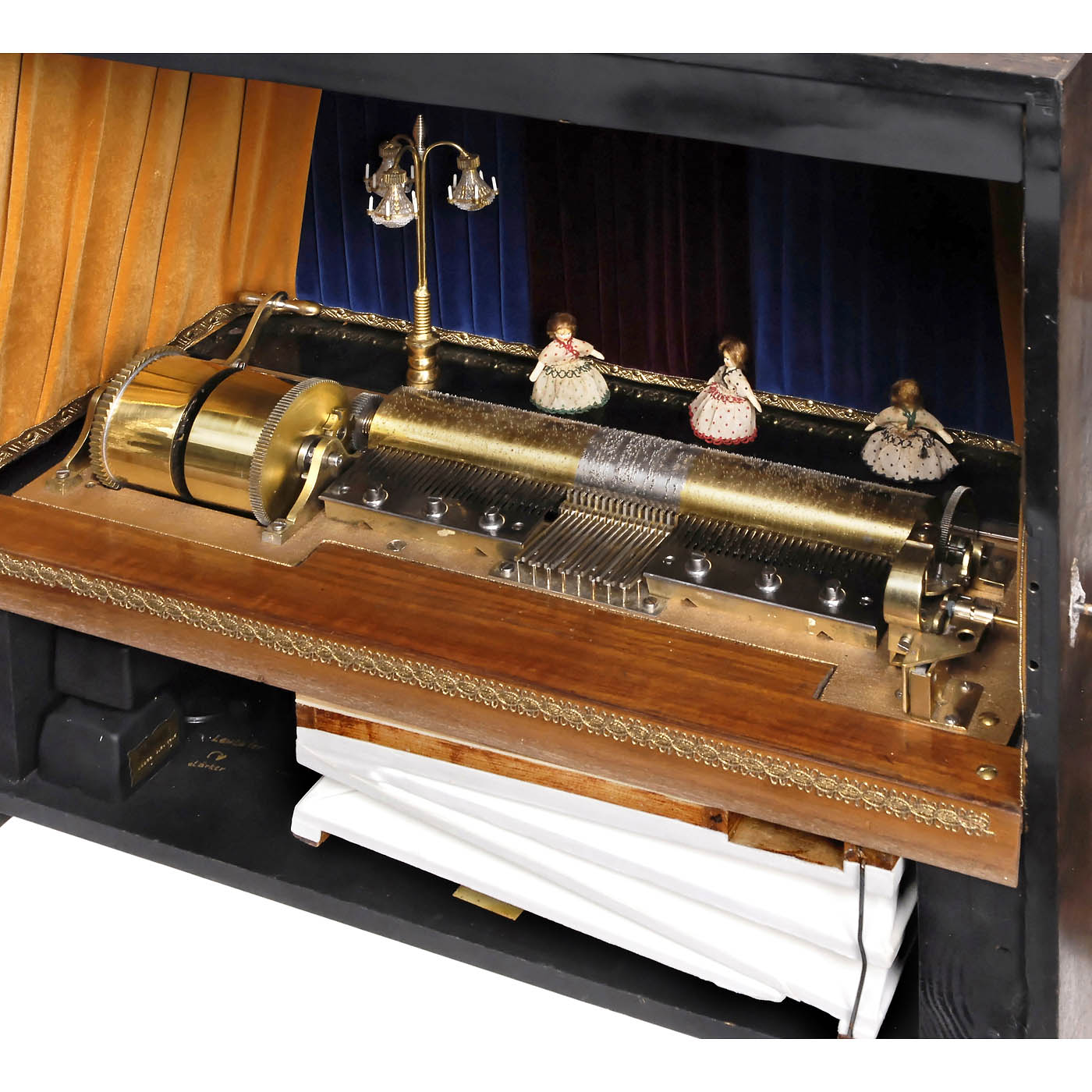 Probably by Karrer-Hofmann, Teufenthal, Aargau, Switzerland. Playing ten airs, with 58 teeth in musical combs (complete, approx. 11 teeth replaced), 16-note organ section, three later dancing dolls, double-spring motor, compensated governor and separate electric motor for the bellows and lighting, in glazed chalet-form case with carved façade, veranda, side balconies and pitched roof, max. dimensions: wd. 34 x ht. 27 in. (87 x 68 cm), cylinder 13 in. (33 cm), restored, replacement parts, dampers in need of adjustment.