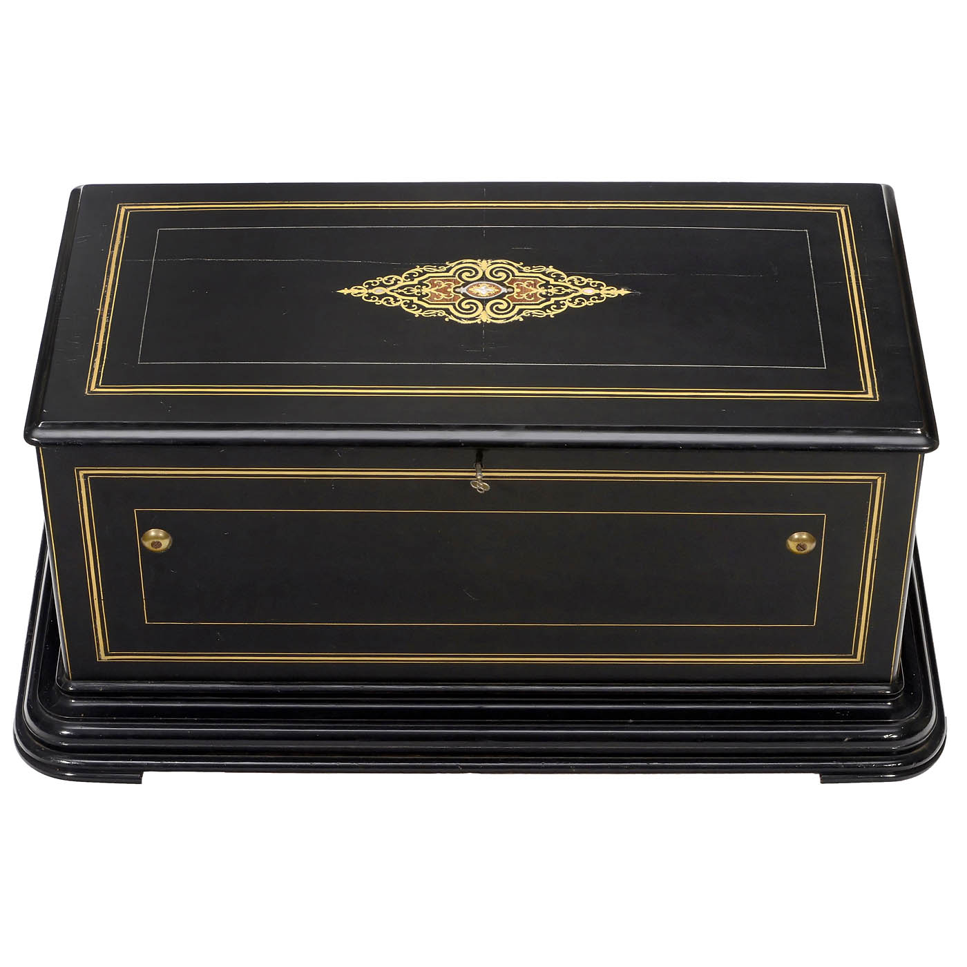 Probably by Paillard. Playing twelve dance and operatic airs including a motif from the "Freyschütz" overture, with 21-key organ section, three bi-chromate automata bell-strikers with articulated heads and hands, six bells, drum and castanet, 51 teeth in the musical and 20 teeth in the optional percussion combs (all four combs complete, one neatly repaired tip visible), compensated governor stamped "A.P. & Co." and tune-sheet headed "Orchestra, Flûtes, Celestial Voices, Drum, Bells and Castanet, Automata in Sight", in veneered and ebonized case with brass stringing and geometric inlay on lid, wd. 36 in. (92 cm), cylinder 19 in. (49 cm), repaired split in lid, on matching table with turned legs and stretcher. With cabinet key. - Provenance: ex-collection of Henry Triquet, Musée d'Instruments de Musique Mécanique; Invisible Musicians Collection, Belgium. - An imposing orchestral musical box, in good playing condition.