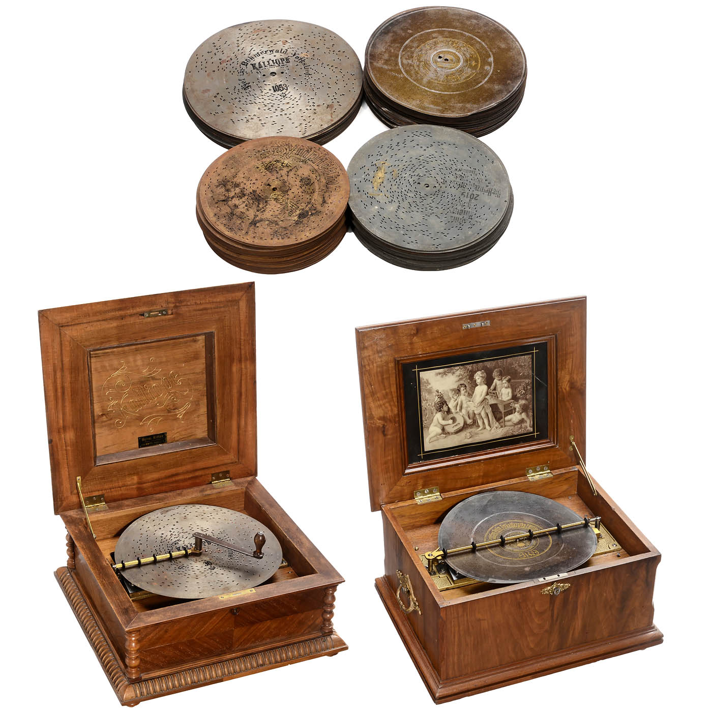 1) Symphonion No. 25, Symphonion Musikwerke, Leipzig. For discs of 11 ¾ in., 84 teeth in 2 music combs (complete), sublime harmony arrangement, crank-wound, walnut case, original lithograph in lid, 2 brass handles, playing condition, no crank included, with 31 discs (some with dents around the edges). - 2) Kalliope No. 62G, Kalliope Musikwerke, Leipzig. For 131/3-inch discs, 61 teeth in comb (complete), 10 optional bells, spring defective, deluxe walnut case, inner lid with retailer's name "Herm. Ritter Musik-Instrumente, Chemnitz". With 2 cranks and 18 discs. - 3) 27 Symphonion discs, Ø 10 in. - And: 4) 26 Polyphon discs, Ø 11 ¼ in. (some with dents around the edges).