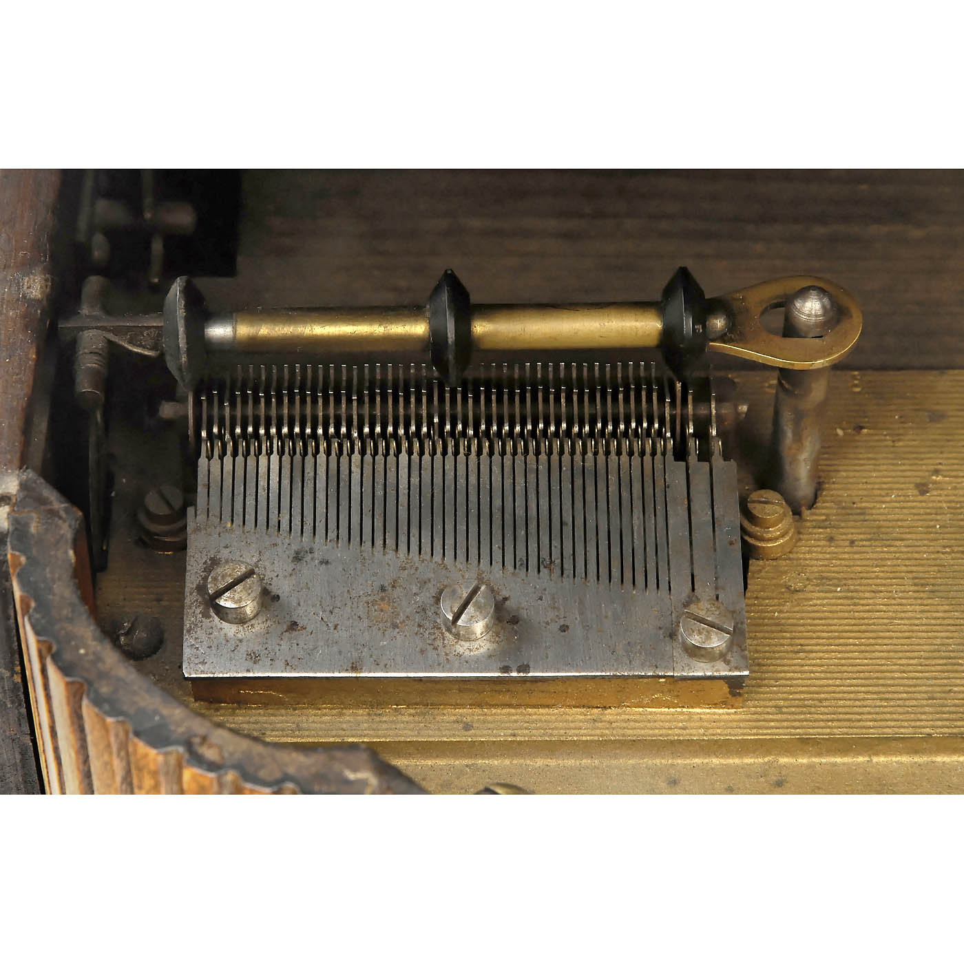 With 7 5/8 in. Kalliope movement, manufactured by J.C. Eckhardt, Stuttgart. 43 teeth in steel comb (complete), walnut case with brass mounts, 18 ¼ x 10 5/8 in., good working condition, with 12 discs.