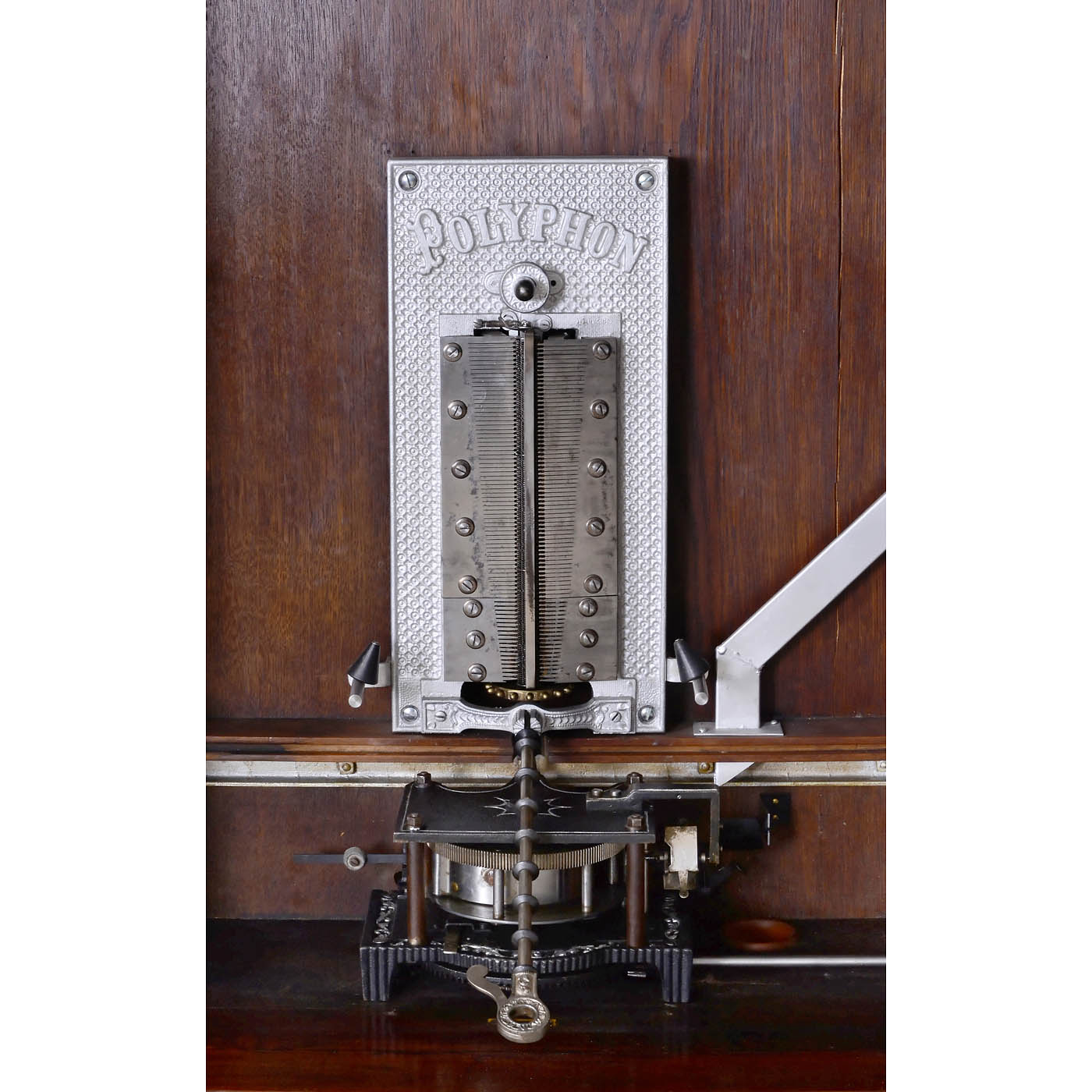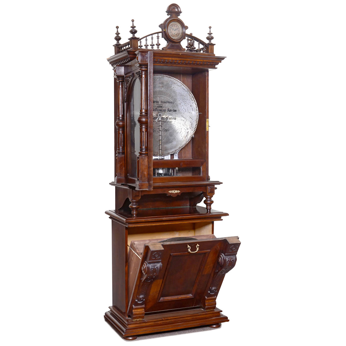 For 24 ½ in. discs. Manufactured by Polyphon Musik werke, Leipzig, coin-operated, 159 teeth in upright duplex comb (complete), walnut case with disc storage base, original gallery and Lenzkirch clock, overall size 34 ¾ x 18 ½ x 98 in., with 18 discs. - A superbly playing collector's item and exhibition piece!