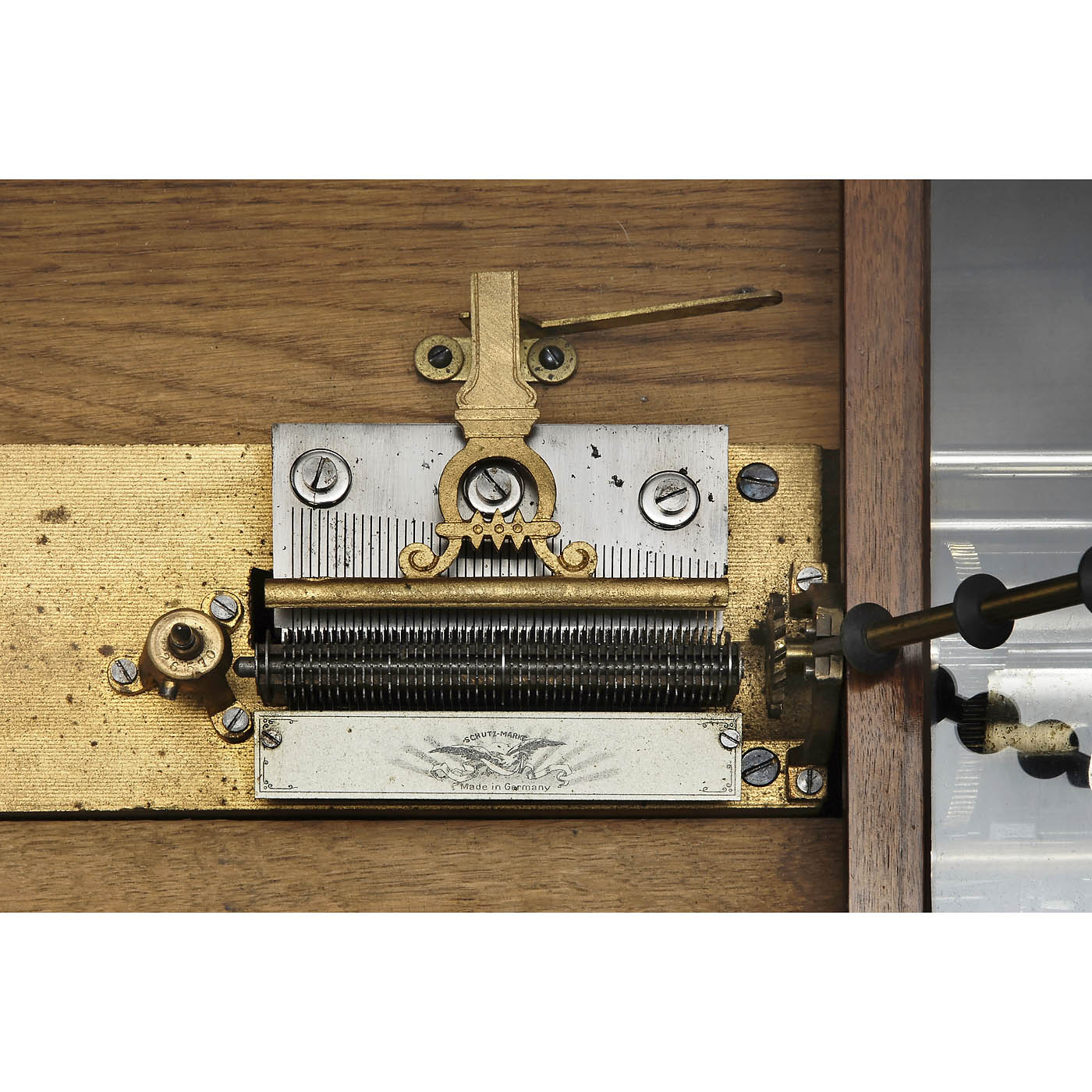 By Heinrich Zimmermann, Leipzig. For 11 in. discs, 50 teeth in steel-comb (complete), lid with original lithograph, visible motor under glass, wood case 19 1/3 x 14 x 9 in., very good playing condition, with 12 discs.