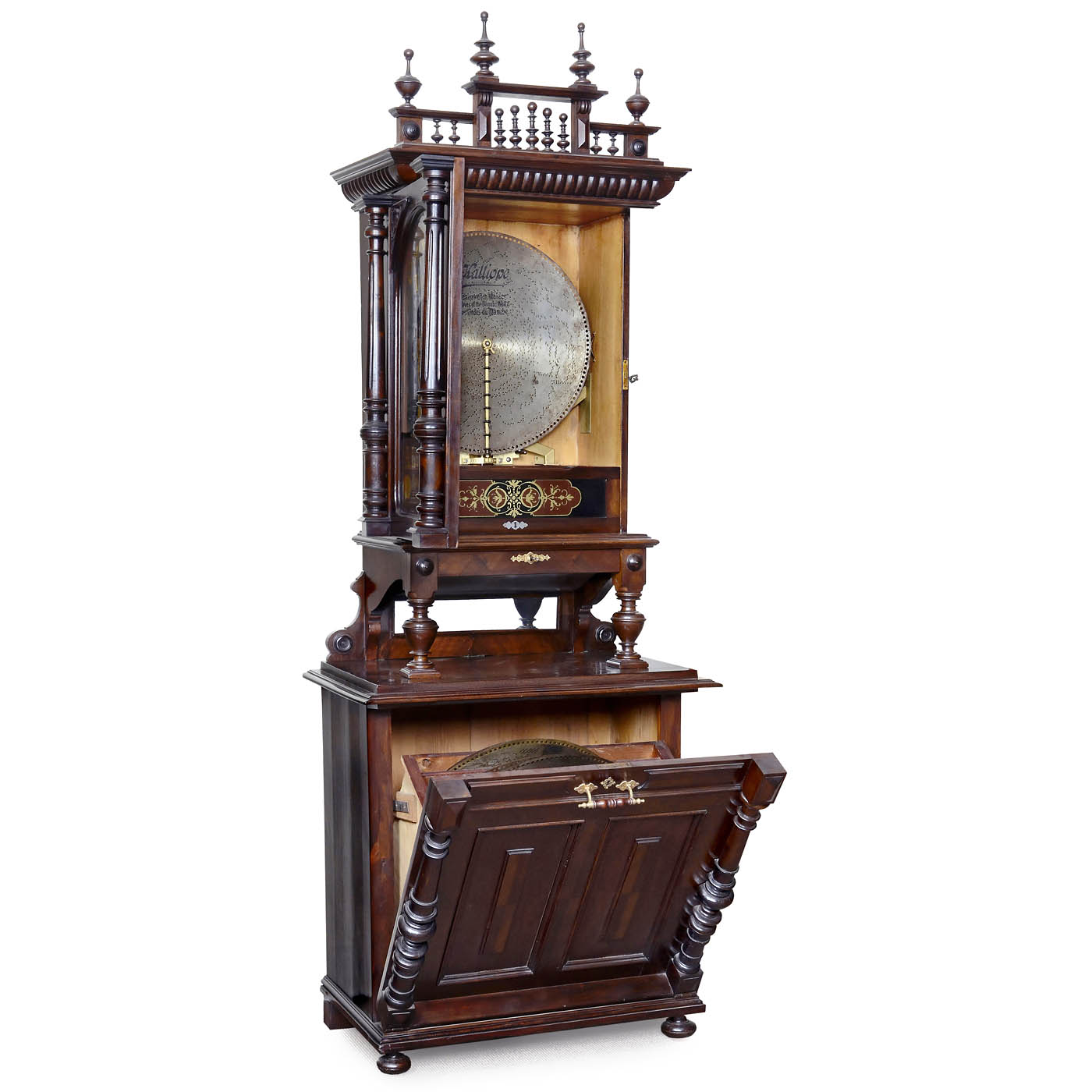 Concert- & Tanz-Automat, manufactured by Kalliope Musikwerke, Leipzig, original glass front panel with gilt lettering and retailer's name "A. Lüneburg - Musik werke, Altona-Ottensen", coin-operated (5 pfennigs), 156 teeth in double comb (one tooth broken), walnut-veneered case with base cabinet and pediment, overall size 34 ¾ x 20 ½ x 103 in., very good playing condition, with extraordinary sound, with 12 discs.