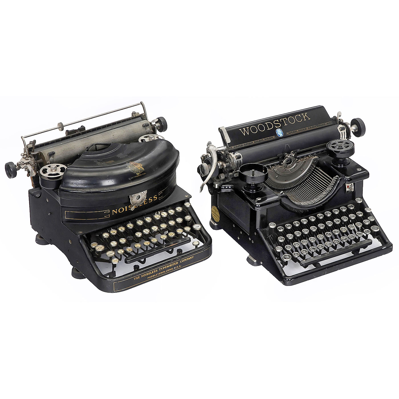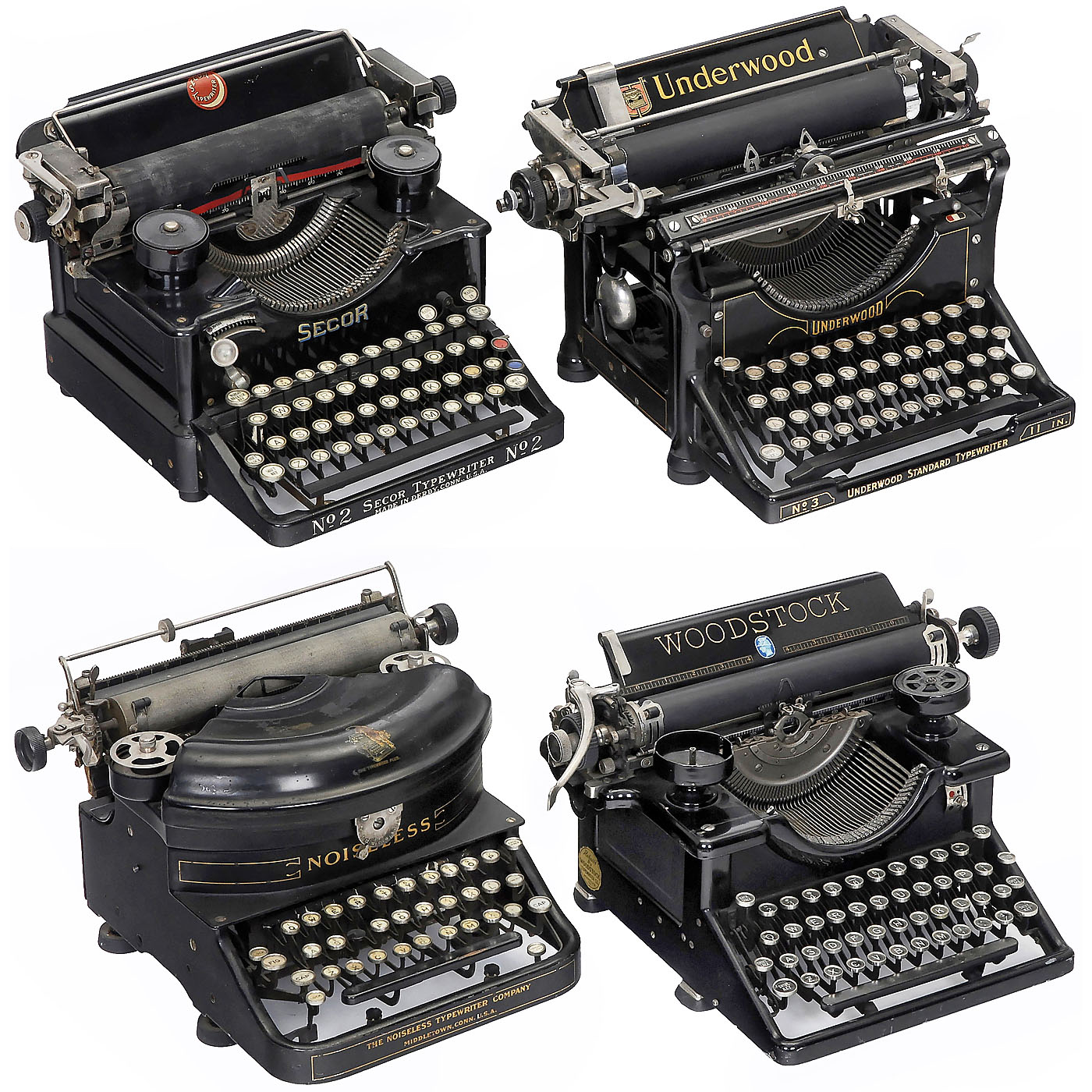 1) "Secor No. 2", c. 1912, Nr. 6170, Secor Typewriter Company, Derby. A well-constructed machine with many special features: typebar control at printing point, inbuilt decimal tabulator, removable escapement and many more. Only around 1500 Secor 2 units were made. Rare, in very good condition. (2/2) – 2) "Underwood Standard No. 3", 1929, serial no. 3801197-11, mechanism sticks. (2/3) – 3) "Woodstock No. 5", c. 1925, no. 370450, missing one leg, carriage slide defective. (2–3/4) – And: 4) "Noiseless No. 1", c. 1912, no. 1-7290, The Noiseless Typewriter Company, Middletown, thrust-action machine. (3/3)