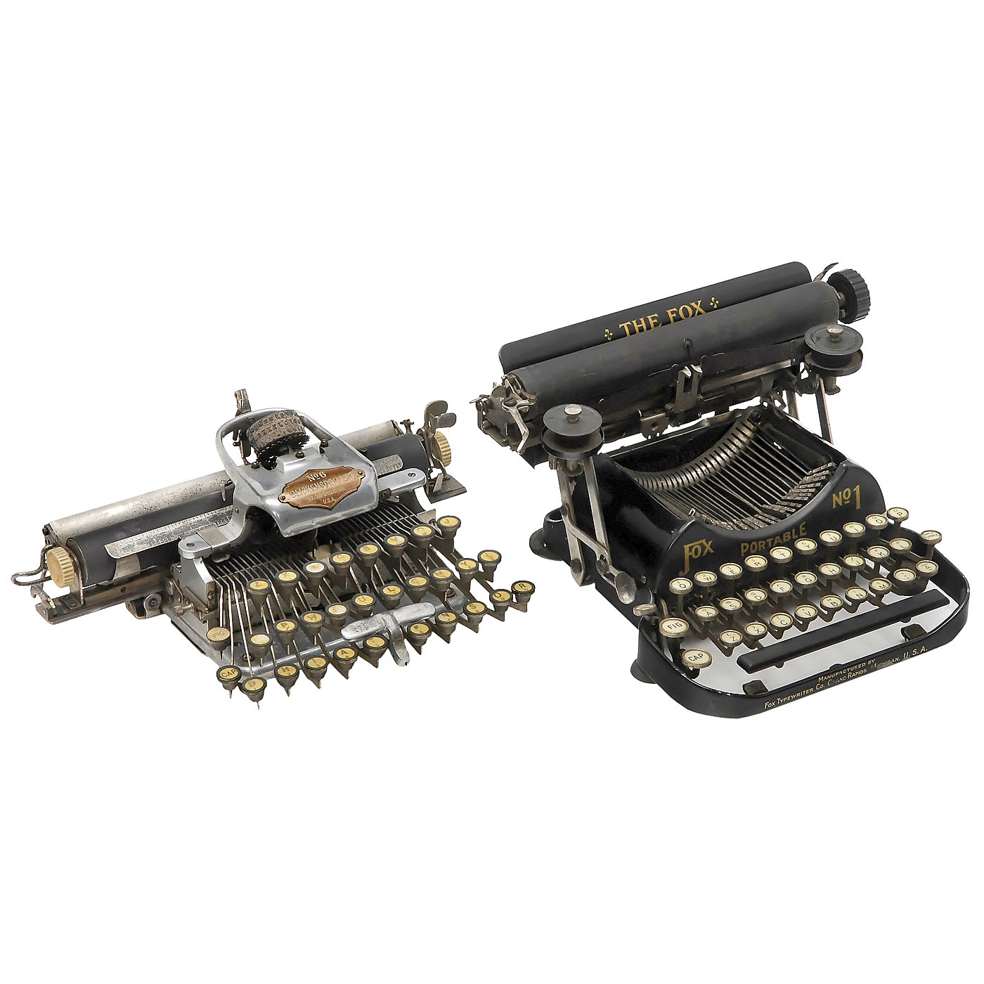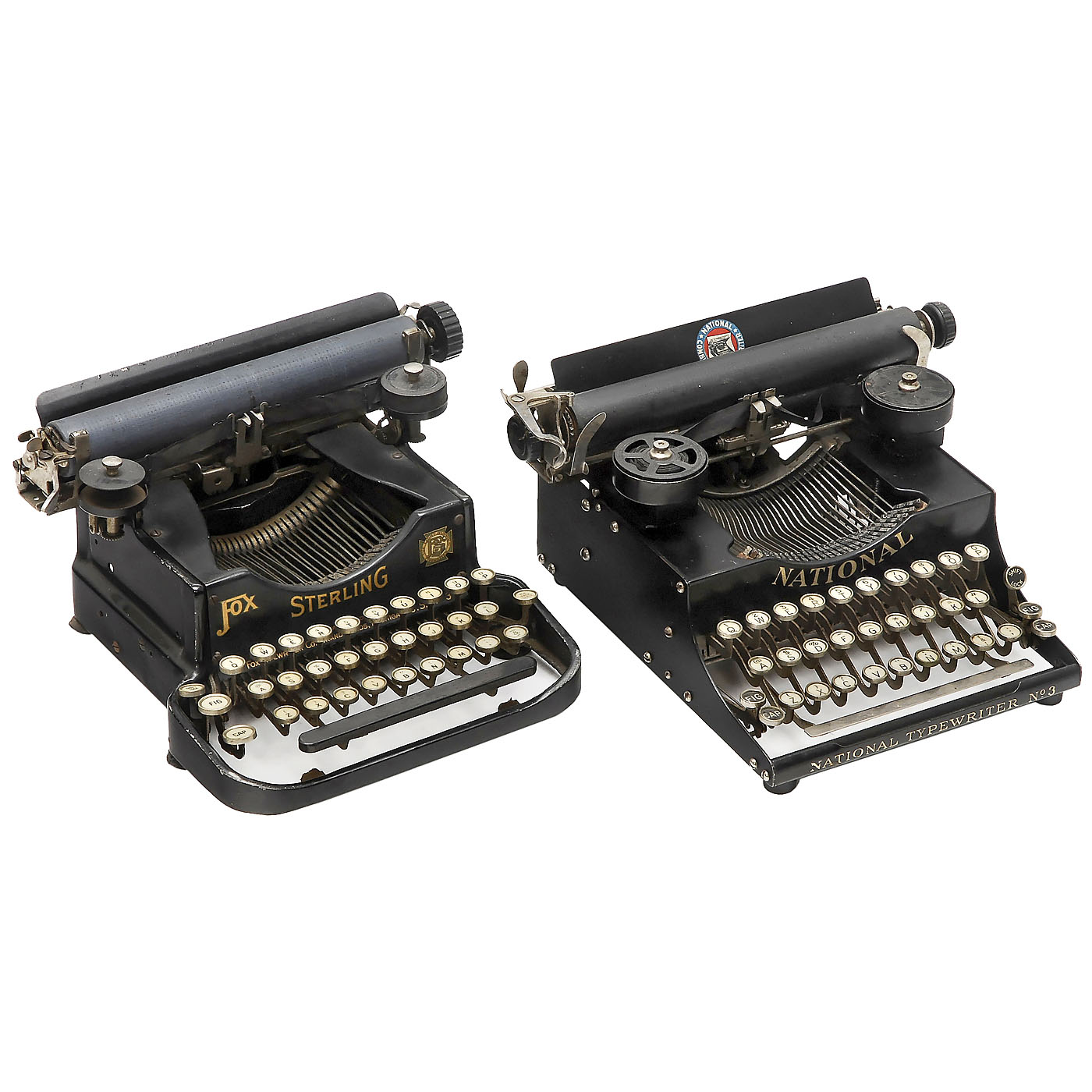 1) Blickensderfer No. 6, aluminum, c. 1910, no. 158183, popular American portable typewheel machine, ink-roller inking, DHIATENSOR keyboard, downstroke, 28 keys in three rows, two shift-keys, 84 characters. (2–3/3-) – 2) Fox Portable, model 1, 1917 onwards, no. 3108, folding model with collapsible carriage. (3/4) – 3) National No. 3, 1929 onwards, 3-row keyboard, serial no. 13382. (2–3/2–3) – And: 4) Fox Sterling, 1921 onwards, non-collapsing 3-bank portable, serial no. 312906. (2–3/2–3)