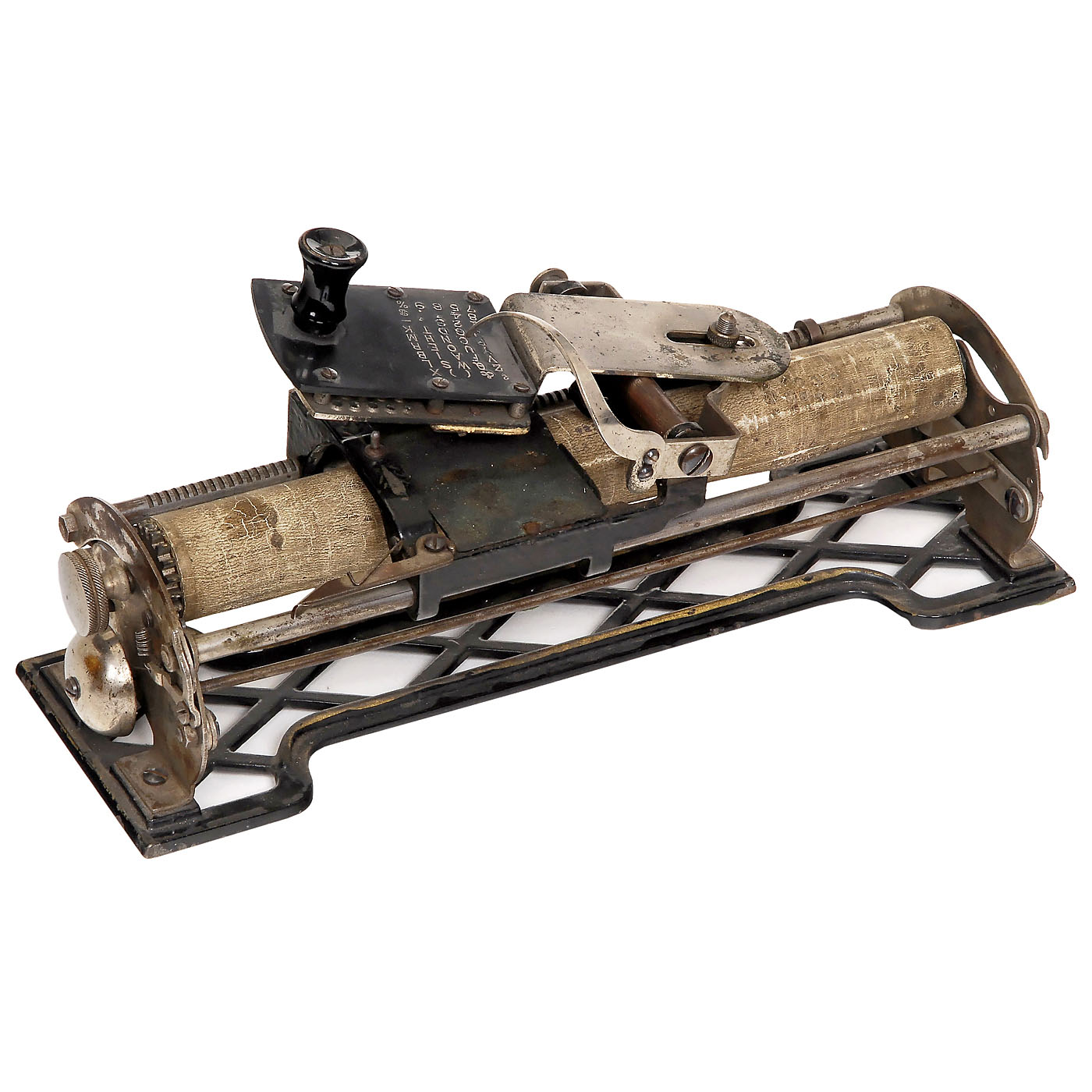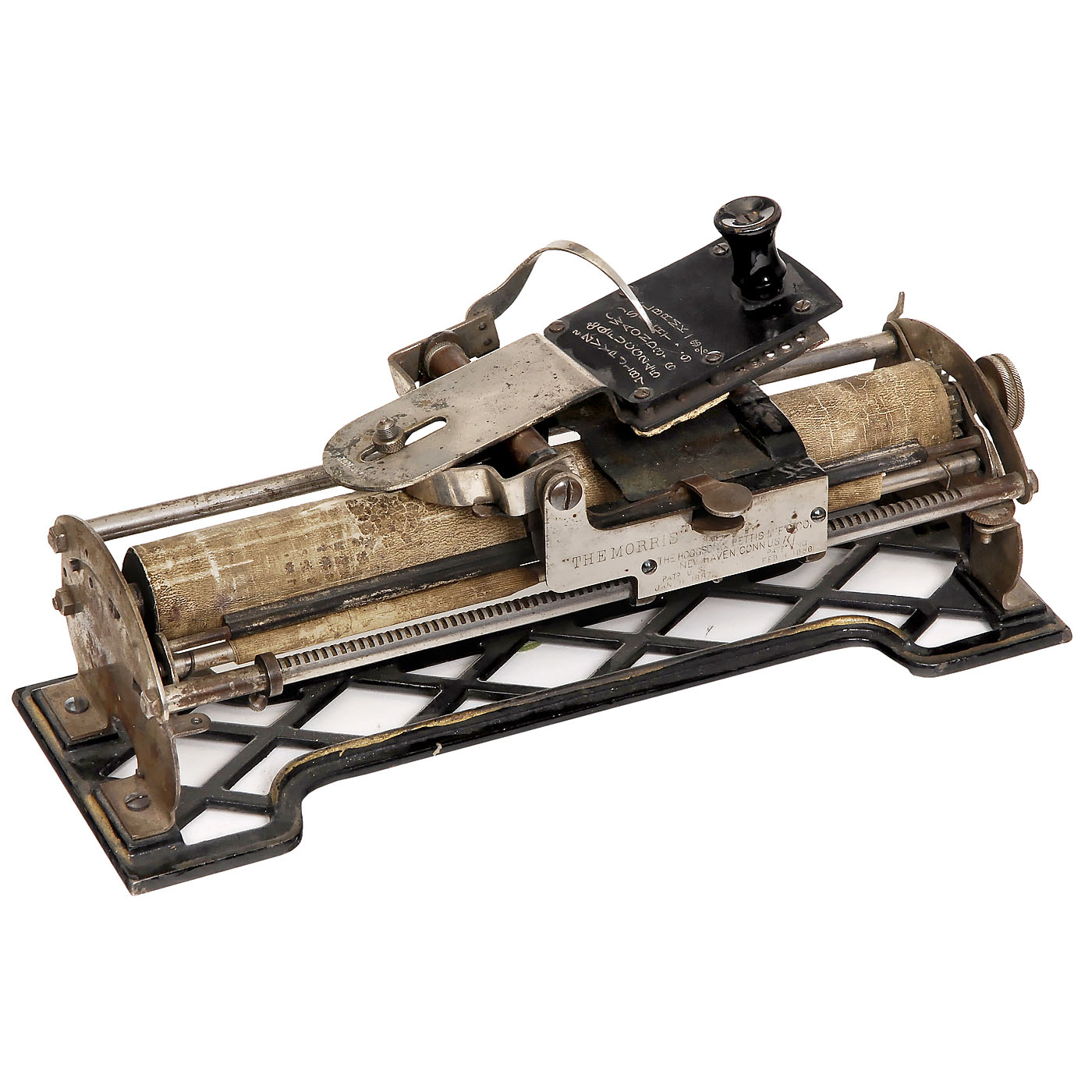 Extremely rare American index typewriter by "The Hoggson & Pettis Mfg. Co., New Haven, Conn., USA". Cast-iron lattice base, square rubber type plate, ink pad. In unrestored original condition! With original wooden box. – Literature: Martin, 1949, p. 88. – One of the most desirable collector's items and a spectacular exhibition piece!