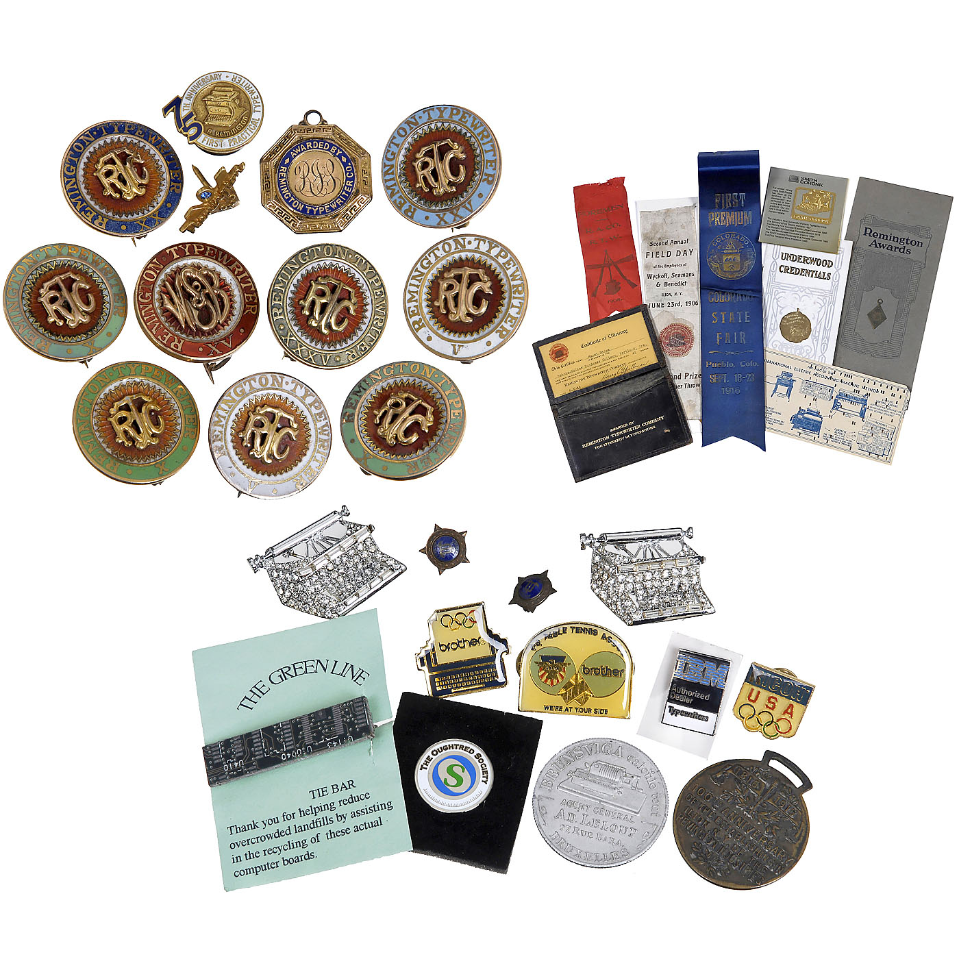 1) 9 Remington service pins, 5, 10, 15, 20 and 25 years, gilded or 14 karat gold, with enamel detailing, c. 1905. – 2) 2 Expert Typist pins, c. 1910. – 3) Brother-Olympia pin. – 4) Brass pendant 100th Anniversary Remington, 1916. – 5) Remington award "For proficiency in Typewriting". – 6) 8-karat Remington sticker. – 7) Remington pin "75th anniversary first practical typewriter". – 8) Brunsviga calculating machines, 20-year calendar (1907–1927), in coin size. – 9) 12 further pins and prices.