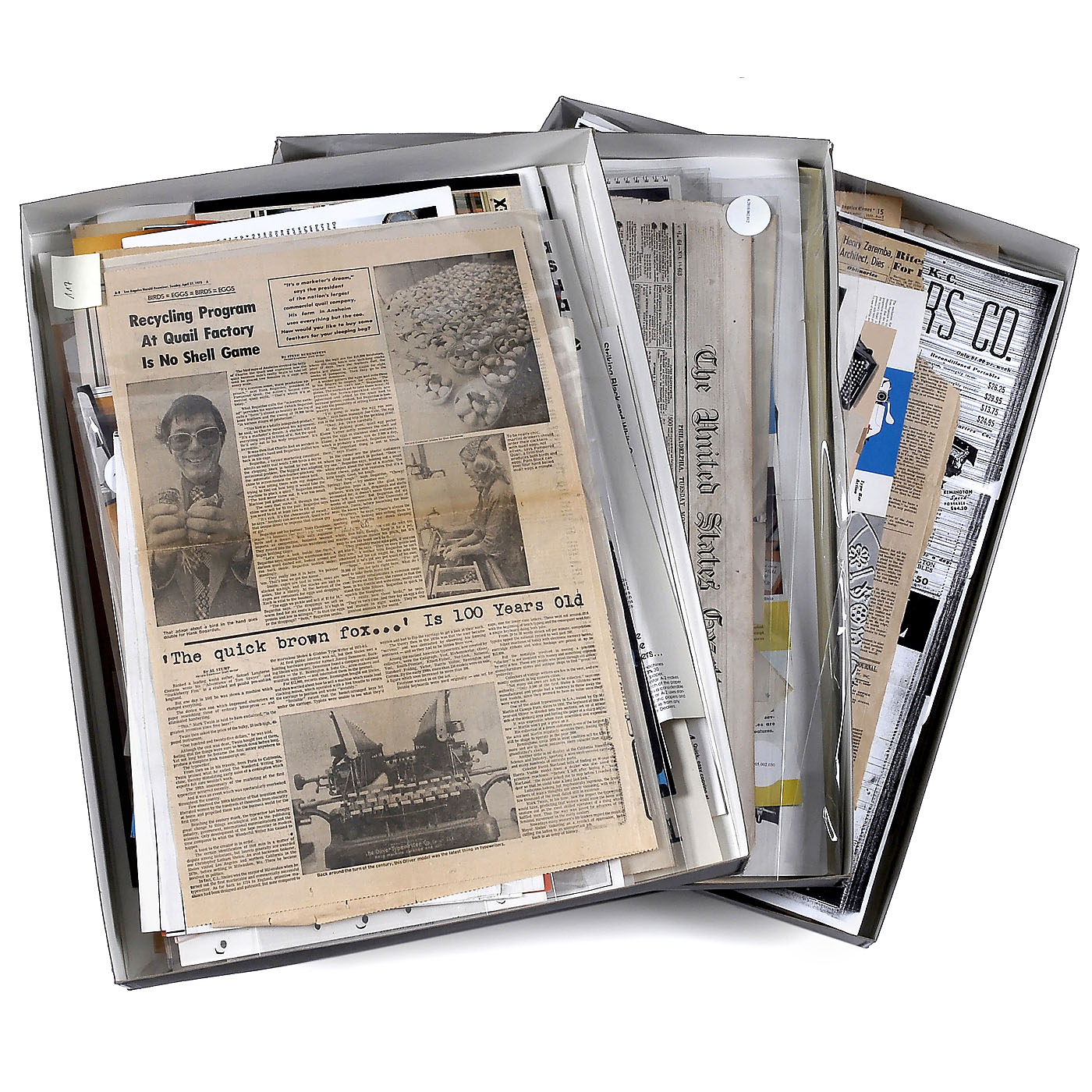 Most of them flyers and newspaper advertisements, articles, some photocopies, calendars, photos and more. Including early "Scientific American" pages and "Smith Corona News". All about typewriters, calculating machines, photocopiers and cash registers. In total approx. 300 items. – Not all pictured.