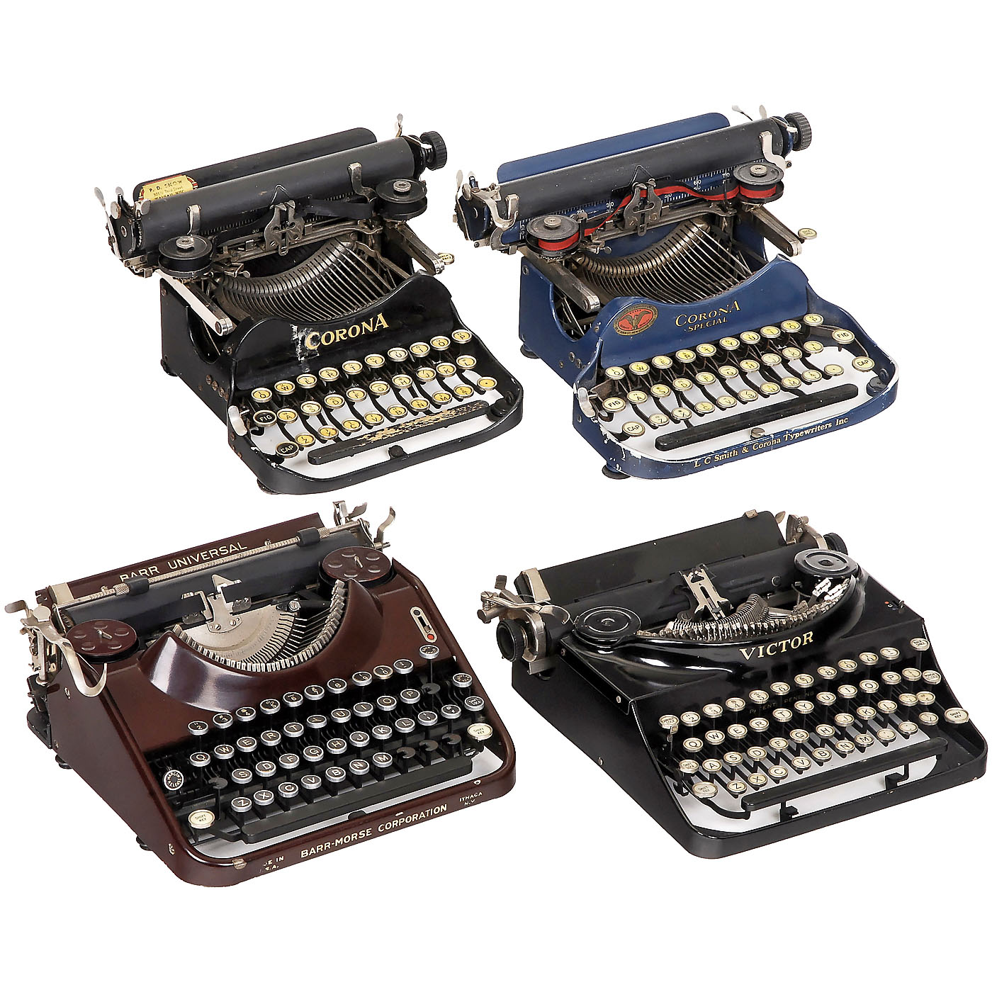 1) Corona Special, blue, folding, no. BX664930, working. – 2) Victor model 2, no. 0010002, carriage escapement faulty. – 3) Barr Universal, maroon, no. B3U922, missing 5 key pads, working. – And: 4) Smith Corona, folding, no. 446183, working.