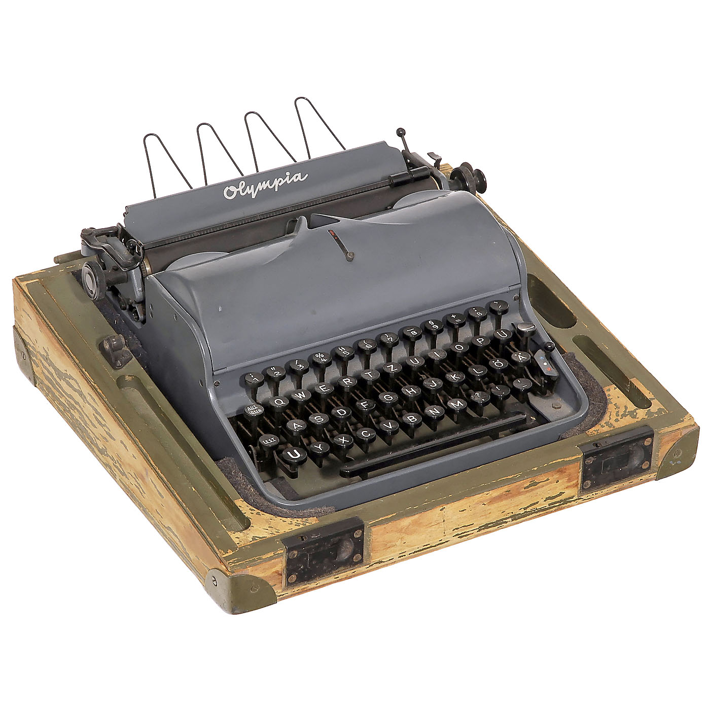 Military grey front-stroke typewriter of the WWII era. 4-row keyboard with "SS" key. Serial no. 413919, with case and instructions in lid..