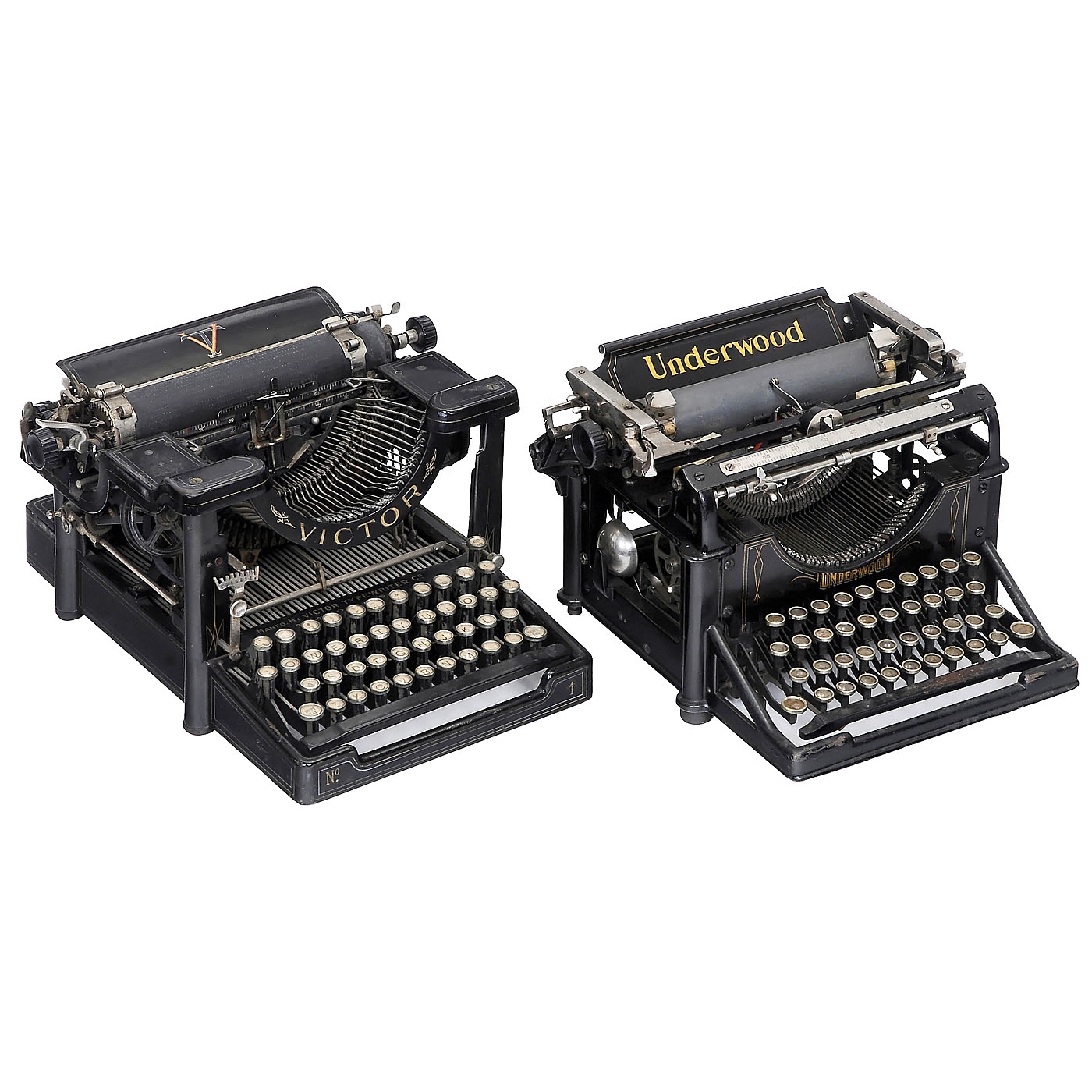 1) "Underwood No. 1", 1896 onwards, Wagner Typewriter Co., New Jersey, no. 12147-1. (2–3/2–3) – 2) "Monarch No. 2", c. 1910, The Monarch Typewriter Company, Syracuse, no. 73049. (3/3) – 3) "Harry A. Smith No. 4", 1916, repainted and relabeled Victor No. 3 typewriter, no. 10332. (3/3) – And: 4) "Victor No. 1", 1907, Victor Typewriter Company, New York, no. 544. (2–3/2–3)