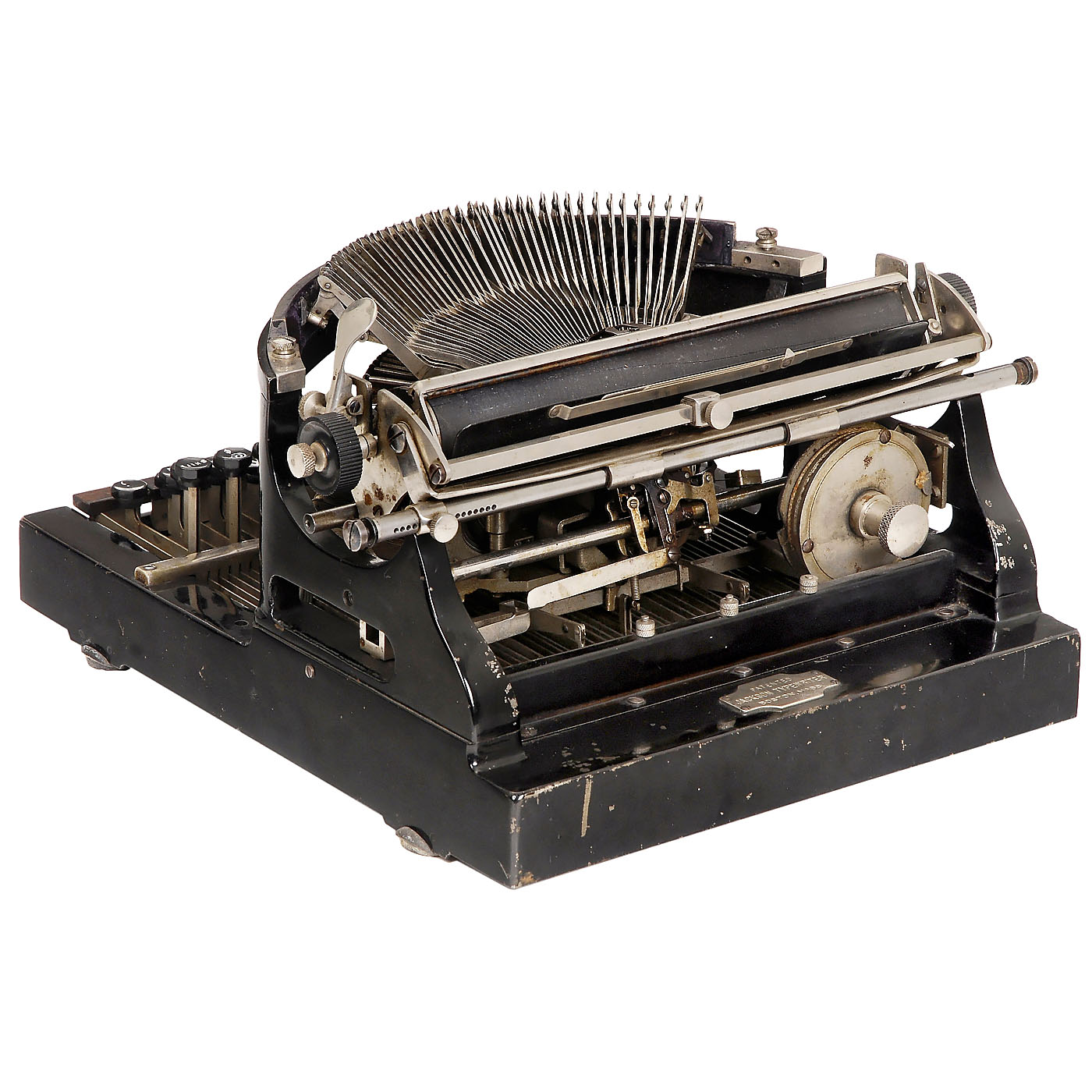 American "Grasshopper-action" typewriter by Joseph Hassel Jackson, nickeled maker's plaque "Patented Jackson Typewriter, Boston, Mass.". Serial no. 597. – Literature: P. Lippman, 1991, p. 110. – See also: https://site.xavier.edu/polt/typewriters/jackson.html – Extremely rare, one of few units produced.