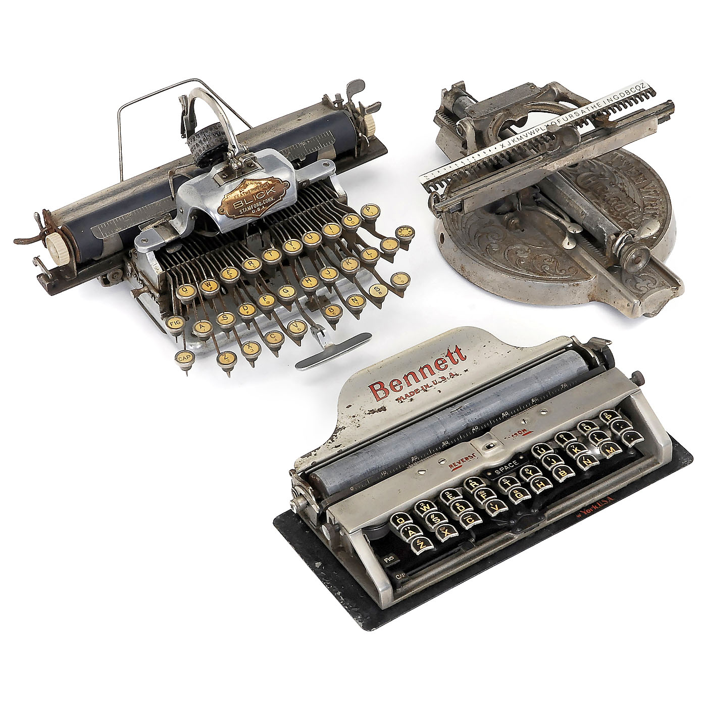 1) "Odell No. 2", 1890, no. 30415, index typewriter, not complete. (4/4) – 2) "Blick Aluminium Featherweight", 1913, no. 176514, in need of cleaning, with case. (3–4/4) – And: 3) "Bennett" (silver), 1907, in good condition, with cover. – Literature: Martin, 1949, p. 217. (2/3)