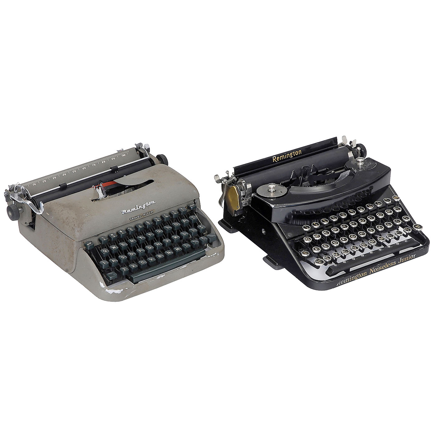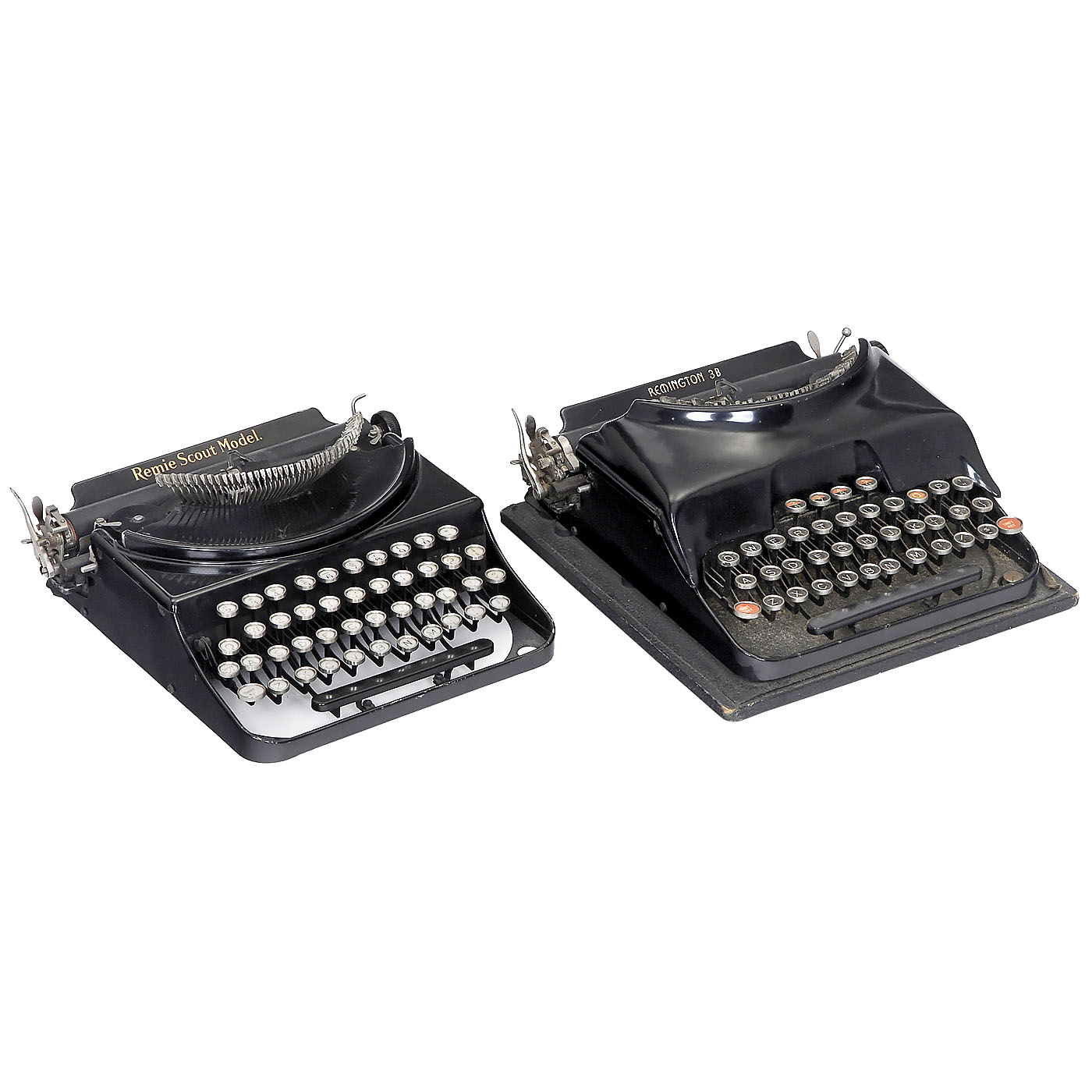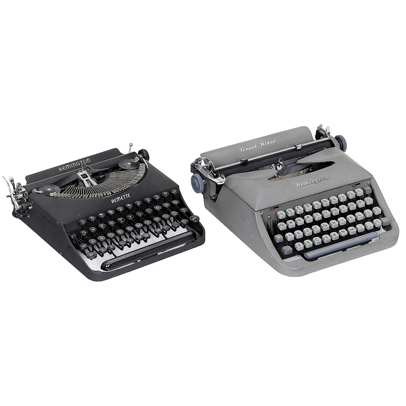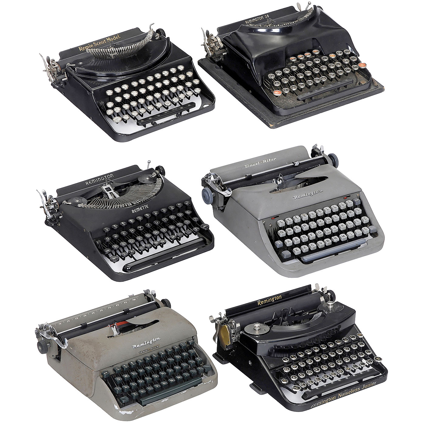 1) "Remington Noiseless Junior", with case. – 2) "Remington 3B", very rare. – 3) "Travel-Riter", grey keytops. – 4) "Remette". – 5) "Travel-Riter", green keytops, with case. – And: 6) "Remie Scout Model", double case, with folding typebar mechanism.