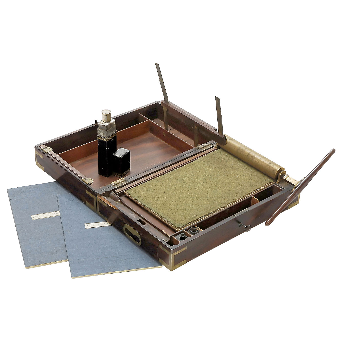 On February 14th, 1780, in England, 240 years ago, James Watt, inventor of the large steam engine, was granted a patent no. 1244 for his first duplicating machine. The machine was sold by James Watt & Company, Soho/Birmingham, England. His invention grew out of the needs of his own business as he had permanent correspondence with his partner Matthew Boulton while traveling – mostly to his steam engine projects in Cornwall. James Watt was too often frustrated when he received Boulton's answers to his own written questions after an absence of several weeks, because of course he had no copy of the original correspondence. The result was Watt's development of the world's first portable copying press! By the end of 1780, 150 machines had already been sold, rising to 630 by the conclusion of the first full business year. – It is reported that in the early 1780s Benjamin Franklin, George Washington and Thomas Jefferson used the James Watt copying machine. In 1785 Jefferson was using both the stationary and the portable presses by James Watt & Co. – The portable case opened on hinges, and its upper section contained a collapsible writing pad for preparing the documents. The typewriter had not yet been invented, and copies could be produced from handwritten letters, diagrams and drawings executed in a special copying ink! Underneath the writing pad was a compartment for used letters after the copying process was complete. The bottom part contained a special compartment (the "damping box") which was used for treating the copying paper. After 12 hours of preparation, the sheets were thoroughly moist, and thus treated and ready to be used for copying. The number of sheets required for immediate use could be removed, and the remainder left in the box for up to two weeks, ready to be used at any time. – The actual copying apparatus consists of two brass plates turned via the side handle, located in the bottom section of the case. The original document was placed in the copying plate in between the felt-covered swing-up cover plate; the moist copying paper was placed on top of it, and was then covered by oilpaper. The pressure, induced by slowly turning the plate, caused the special copying ink of the original to be taken up, and thus transferred, onto the moist sheet (mirror inverted). The copy was ready for use after 24 hours in a drying book of absorbent paper (as used for postage stamps). Because the ink was offset in this manner, the print of the copy could, of course, be read only on what was actually the reverse side of the page. The prerequisite for producing good copies was the special copying ink in which the original was written. A great deal of practice was also necessary to prepare sheets for use as copying paper, since they had to be uniformly moistened. The case also contained inkwells as well as containers of dry ink powder for making up ink when traveling. – This model is missing writing desk.