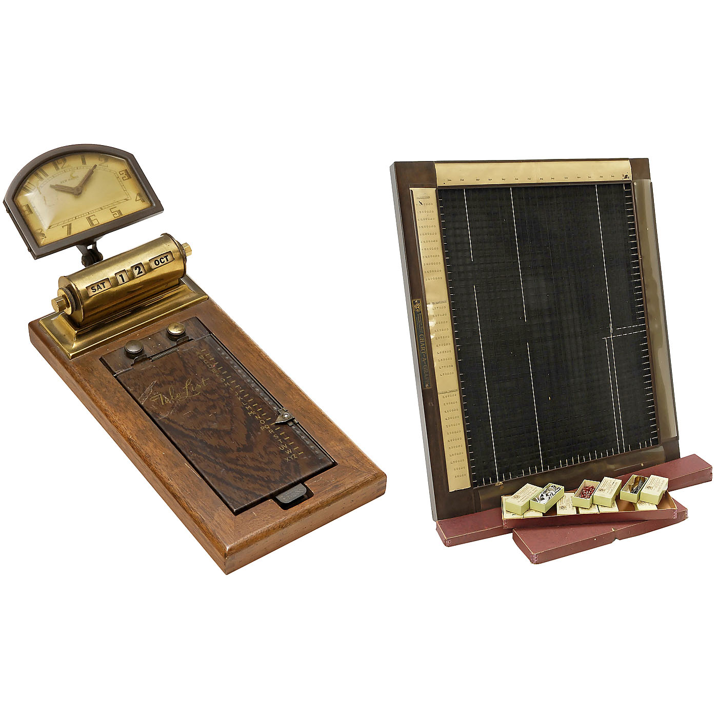 1) Art-Deco desk set, c. 1930, USA, walnut and brass, with "New Haven" mechanical clock (working), calendar and tele-list, size: 12 ½ x 4 ¾ in. Very decorative! – And: 2) Chart-A-Graph, 1930, chart panel for mapping trends (for example the stock exchange) with coloreds pins, made by Remington Rand Business Service, USA. With 10 boxes with pins and other parts, size 20 ½ x 24 4/5 in.