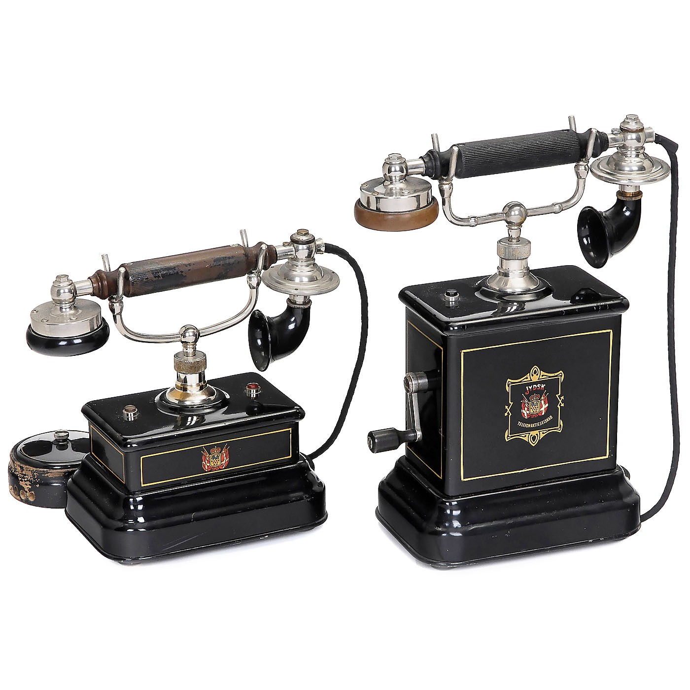 "Jydsk Telfon Aktieselskab", metal cases with original decals, handsets with speaking horn, one telephone with crank inductor.