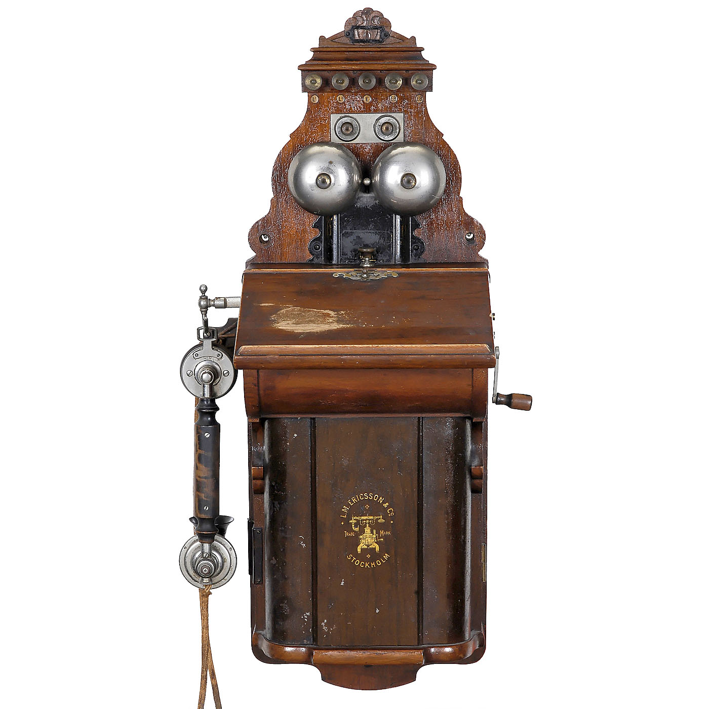 L.M. Ericsson, Stockholm. With writing slope, metal battery lid, original handset with speaking horn, 4-magnet inductor and crank.