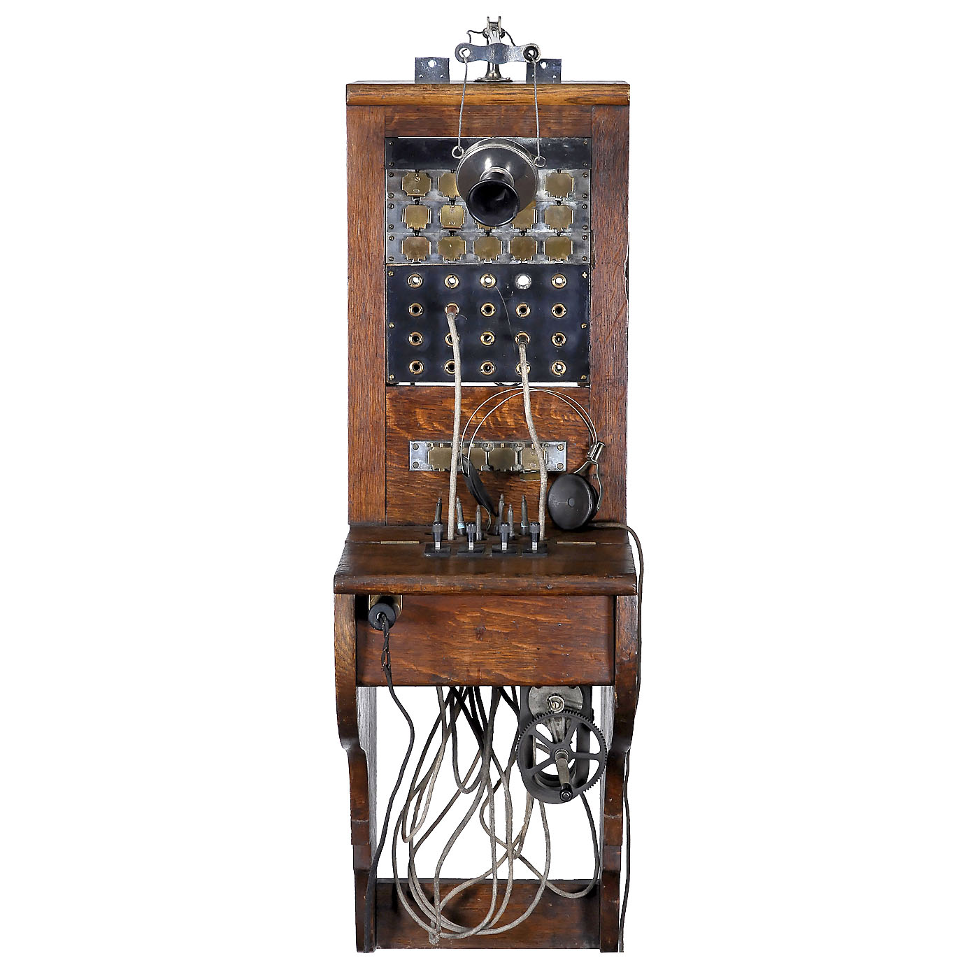 Oak case, 15 lines, 3-part induction coil, Couch & Seeley transmitter, headset by American Telegraph & Telephone Company, height 40 in.