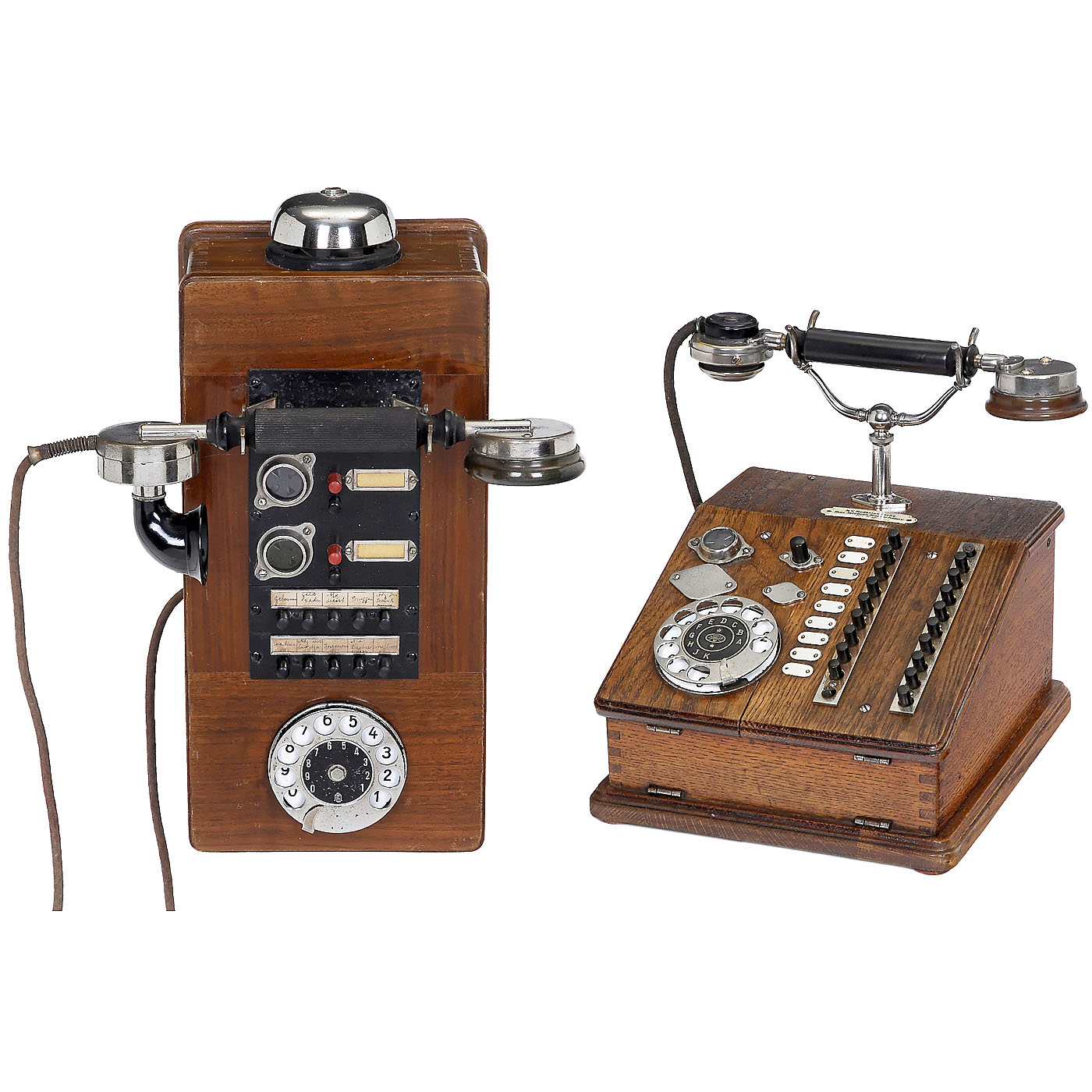 1) Tefag, for 20 lines, dial, handset with hygienic speaker, oak case. – And: 2) Mix & Genest, for 10 lines, dial, handset with speaking horn, walnut case.