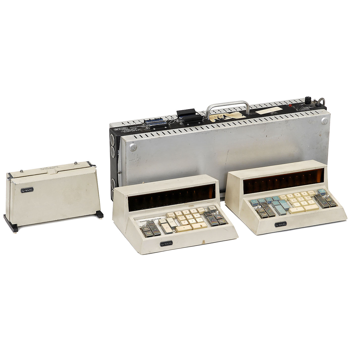 Wang Laboratories, Tewksbury, Massachusetts, USA. Consisting of electronic package 360SE for four simultaneously operated keyboards, serial no. 281831, 2 keyboards, model 300 and 320, each with 11 Nixie tubes (mathematical symbols and 10 digits), glow lamps for decimal places and keys with micro switches. An unusual piece of calculating history. – In addition: Wang card programmer CP1.