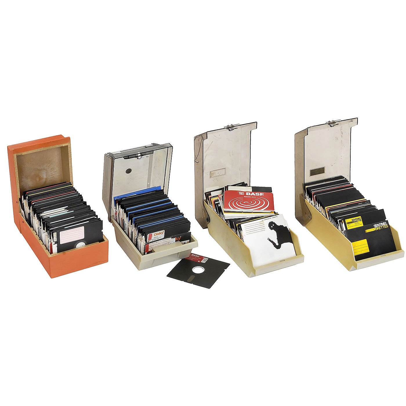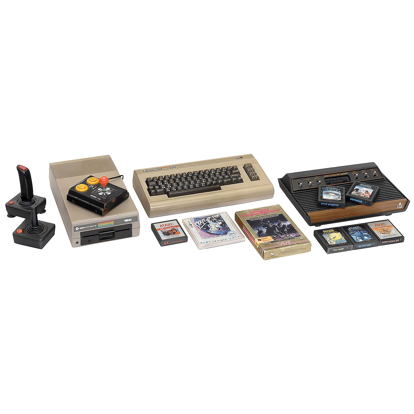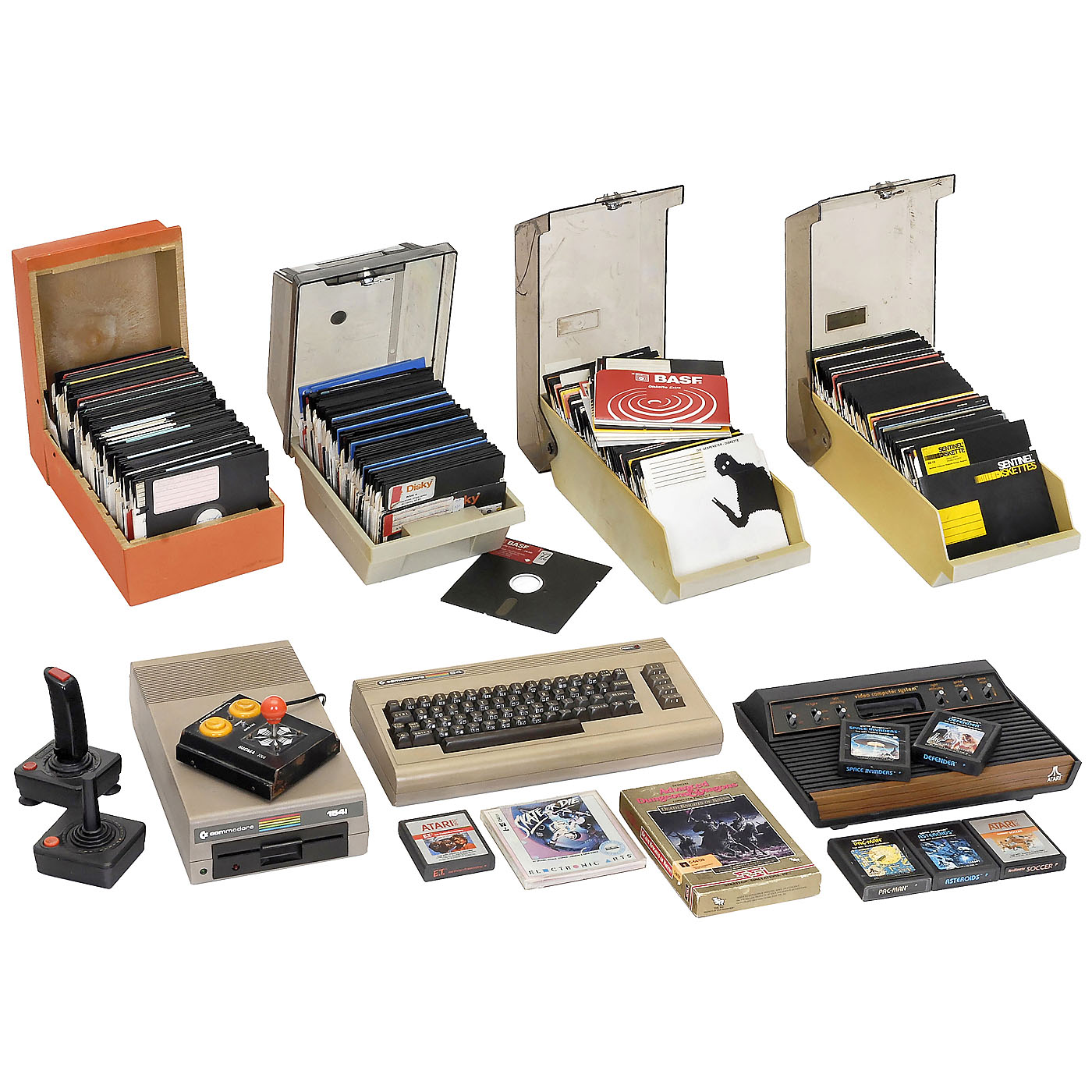 1) Atari Video Computer System (Atari 2600), c. 1982, with Atari CX40 Joystick, power supply and 6 cartridges (Defender, E.T., Space Invaders, Asteroids, Pac-Man and Soccer). – And: 2) Commodore 64, 8-bit home computer, with Commodore 1541 floppy disk drive, Anitech and Sigma 1001 joysticks, power supply and approx. 380 5,25'' disks (copies) with partly rare games.