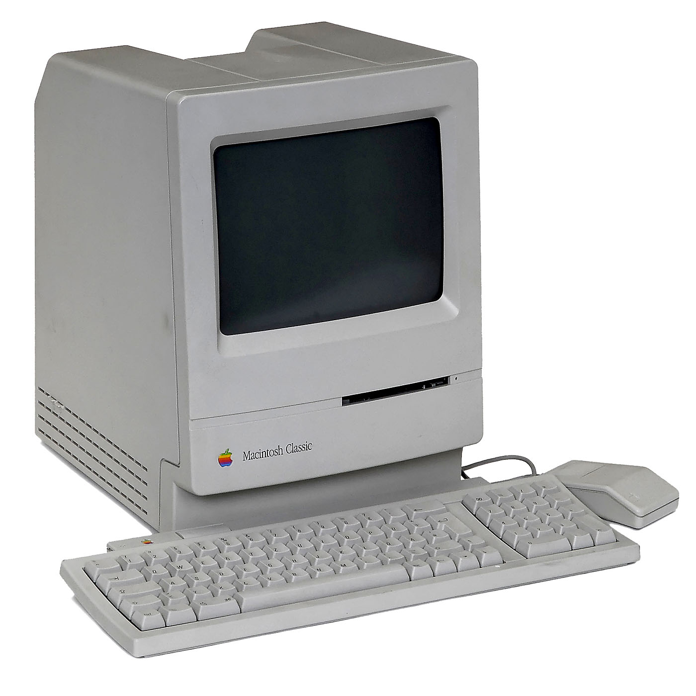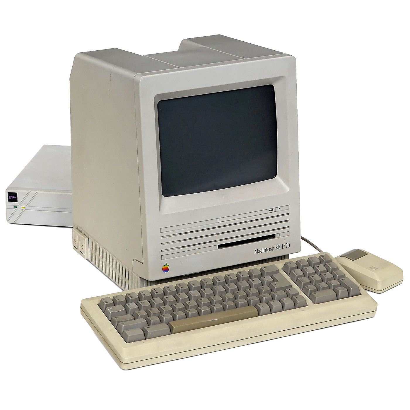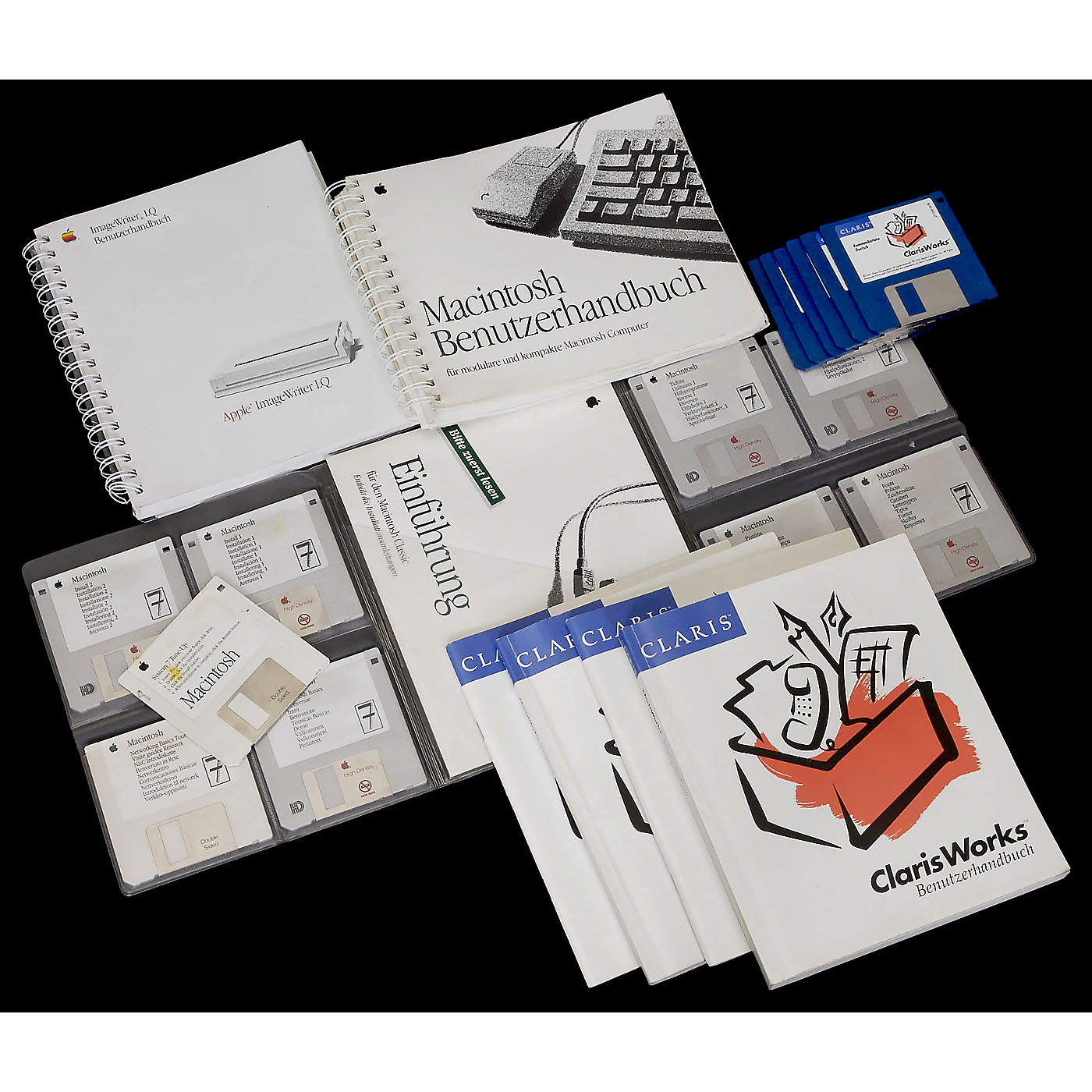 1) Apple Macintosh Classic, model M0420, 220–240 V, with QWERTZ keyboard, mains cable, German manual, 8 Macintosh installation disks with manual, Claris Works (AppleWorks) with 6 disks and 4 manuals, Apple Desktop Bus Mouse and MLI Cordless Super Mouse for Macintosh (new in box). – 2) Original Apple Macintosh carrying bag, for transporting your favorite computer to remote locations. – And: 3) Apple Macintosh SE 1/20, model M5011, 100–240 V, with QWERTZ keyboard, mains cable, external ETC hard disk, Apple ImageWriter LQ including German manual and Apple Mouse M0100.